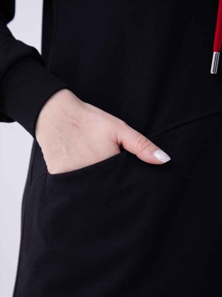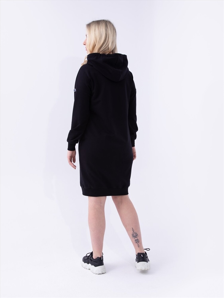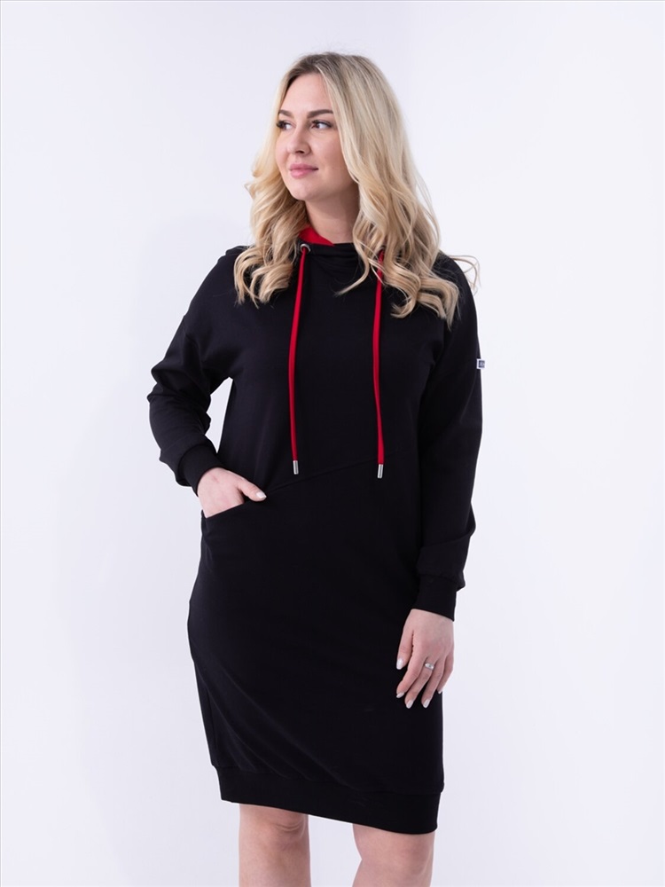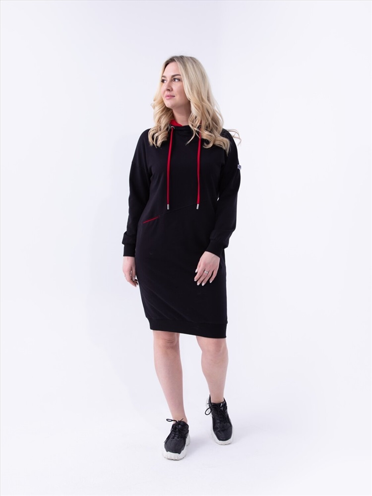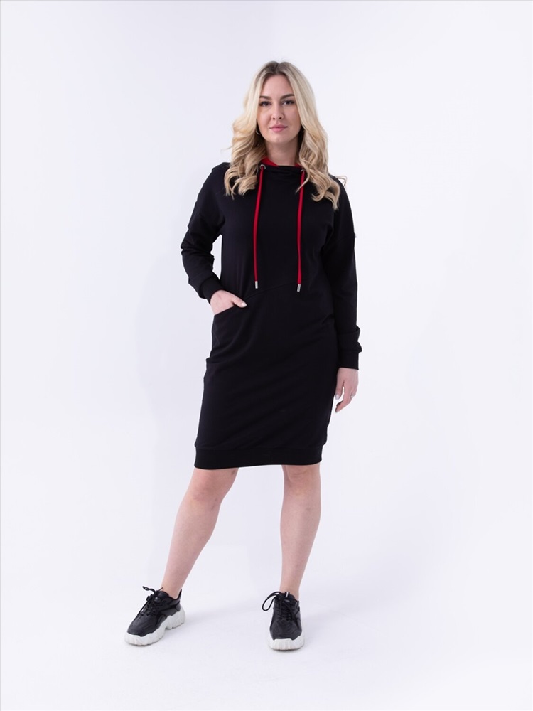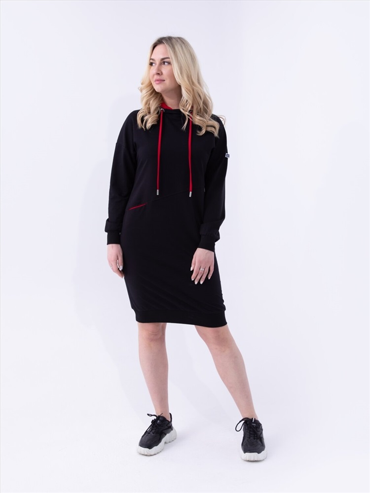 Платье однотонное,свободного силуэта с капюшоном ,выполнено из трикотажного полотна футер 3-х нитка с эластаном.Линия плеча спущена.Рукав втачной,длинный.Низ изделия и рукава обработан манжетом из кашкорсе.По переду платья косой подрез в котором есть карман.Карман полноценный из контрастной ткани кашкорсе. Модель относится к стилям спортивный шик или спорт кэжуал, поэтому носить его можно и с кроссовками, и со стильными ботинками. Удобное трикотажное платье - беспроигрышное решение для любого случая!.Длина рукава:63 см.Параметры модели: 91/70/101 рост 178