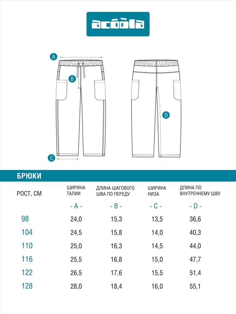 Производитель: Acoola; Артикул поставщика: 20120460124; Состав: 100%Хлопок; Год: 2025; Российский размер: 116; Рост: 116; Обхват груди: 58; Обхват талии: 55; Обхват бедер: 63