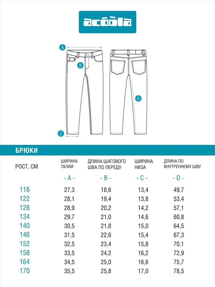 Производитель: Acoola; Артикул поставщика: 20140440002; Состав: 98%Хлопок,2%ПУ; Год: 2025; Российский размер: 128; Рост: 128; Обхват груди: 64; Обхват талии: 58; Обхват бедер: 69