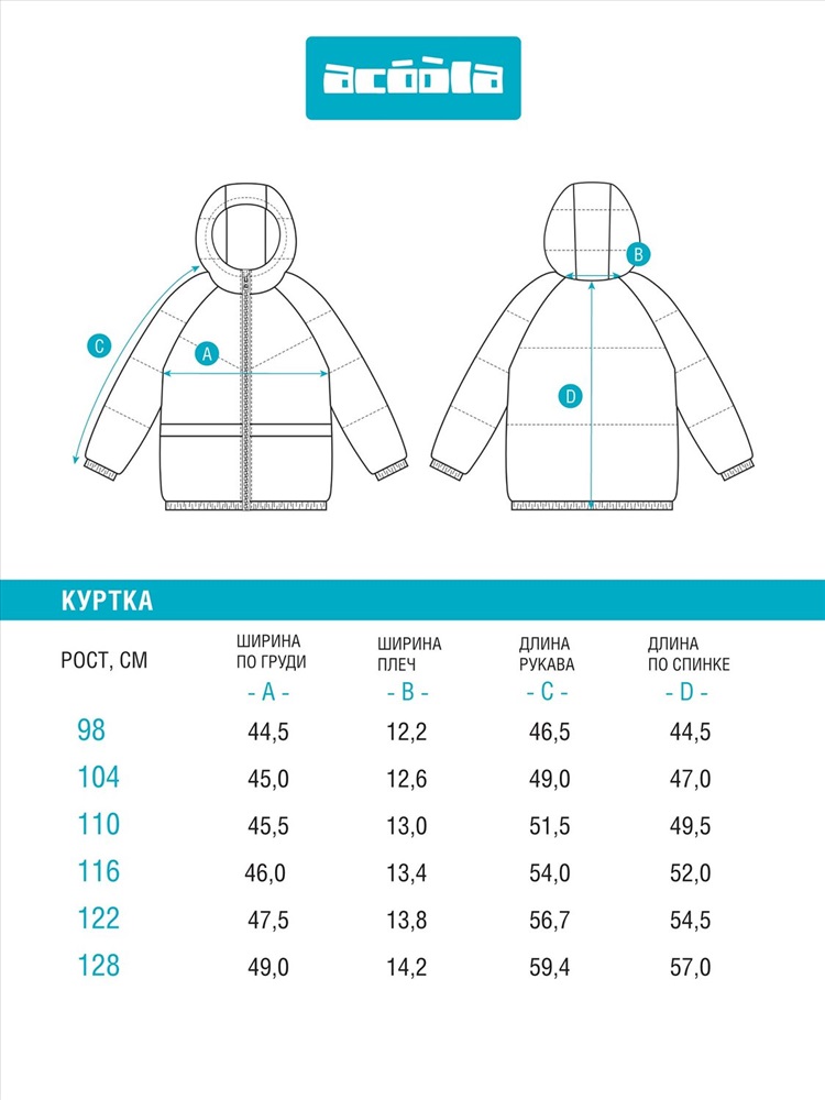 Производитель: Acoola; Российский размер: 104; Рост: 104; Обхват груди: 56; Обхват талии: 53; Обхват бедер: 59; Артикул поставщика: 20120650036; Состав: 100%ПЭ; Год: 2025