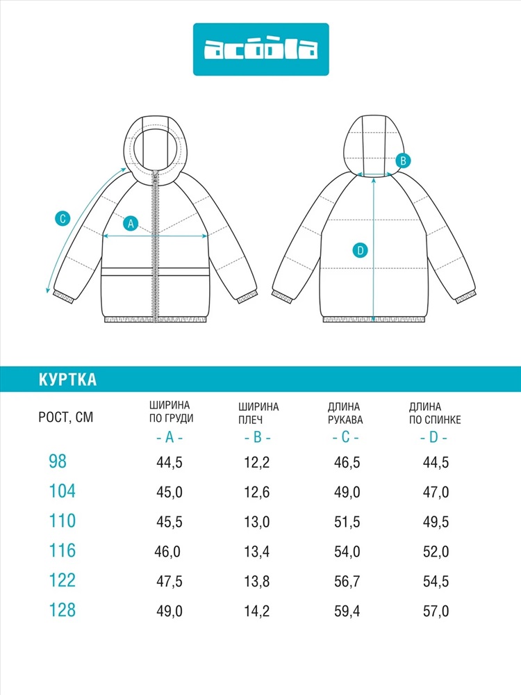 Производитель: Acoola; Российский размер: 98; Рост: 98; Обхват груди: 55; Обхват талии: 52; Обхват бедер: 57; Артикул поставщика: 20120650036; Состав: 100%ПЭ; Год: 2025