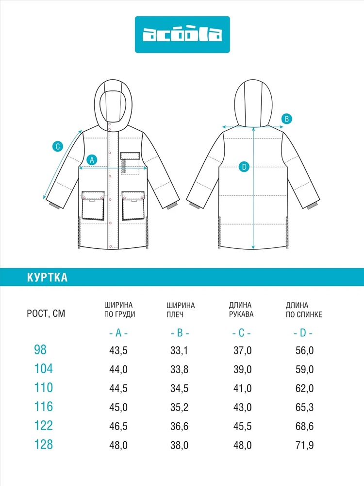 Производитель: Acoola; Российский размер: 98; Рост: 98; Обхват груди: 55; Обхват талии: 52; Обхват бедер: 57; Артикул поставщика: 20120770011; Состав: 100%ПЭ; Сезон: Осень, Зима; Год: 2025