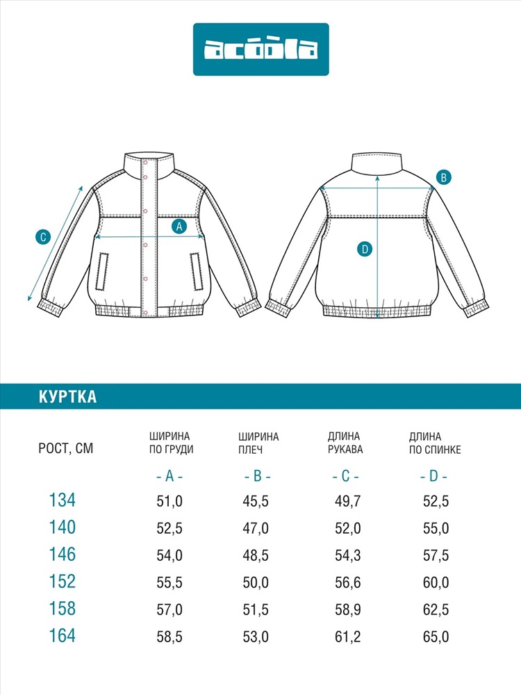 Производитель: Acoola; Российский размер: 134; Обхват груди: 67; Обхват талии: 59,5; Обхват бедер: 72; Артикул поставщика: 20310130014; Состав: Основа 88%ПЭ 12%Хлопок,Покрытие100%ПУ; Год: 2025