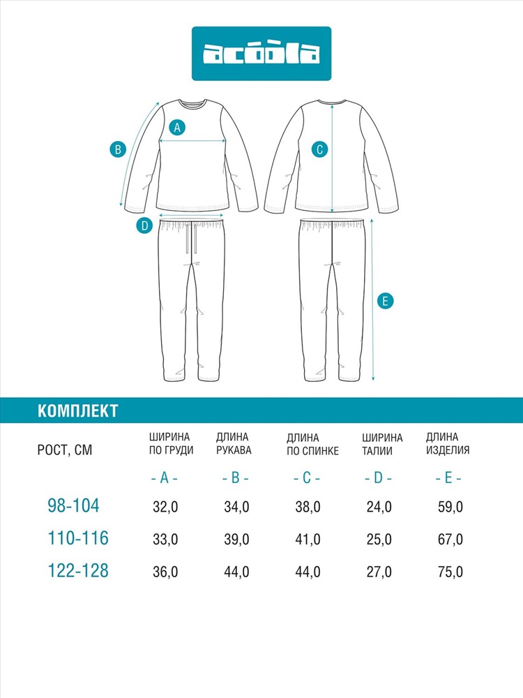 Производитель: Acoola; Российский размер: 98, 104; Обхват груди: 55-56; Обхват талии: 52-53; Обхват бедер: 57-59; Артикул поставщика: 20224280060; Состав: 100%Хлопок; Год: 2025