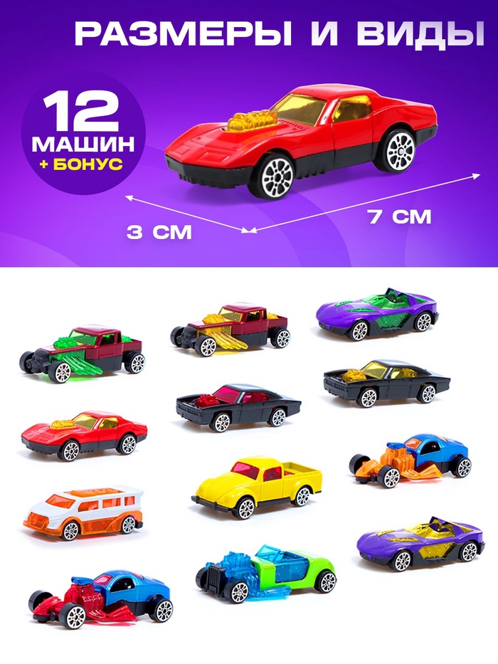 - В наборе 12 машинок разных моделей и цветов, которые не повторяются.