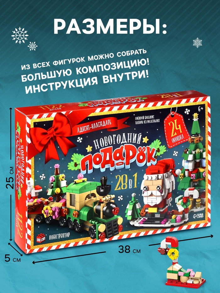Габариты: 38 x 7 x 26 Страна: Китай В боксе: 16 шт Состав: Пластик Материалы: пластик Фасовка: по 1 шт Индивидуальная упаковка: Картонная коробка Габариты товара: 38 см × 7 см × 26 см Сертификат: ЕАС Для кого: Унисекс Возраст: От 6 лет Материал: Пластик Тематика конструктора: Новогодняя Уровень сложности: Средний Размер деталей: Классические детали Создай собственное новогоднее чудо! Новогодний адвент-календарь-конструктор — это 1122 детали для погружения в атмосферу праздника. За 24 окошками скрываются сюрпризы, из которых получается 28 разных моделей.