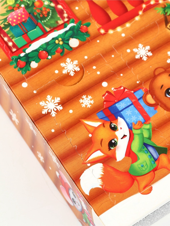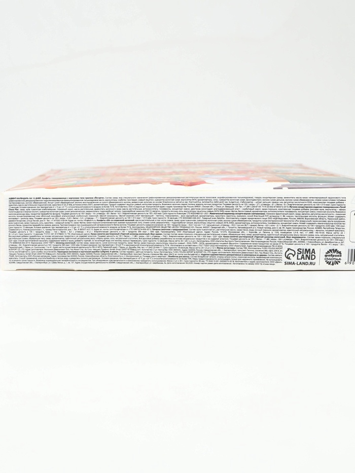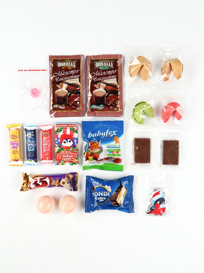 Габариты: 41,5 x 27 x 7 Доставка: Платная Страна: Россия В боксе: 15 шт Фасовка: по 1 шт Индивидуальная упаковка: Картонная коробка / упаковка Сертификат: ЕАС Цвет: Разноцветный Для кого: Для мальчика, Для девочки В наборе, шт.: 19 Вес нетто, г: 140 Вид упаковки: Подарочная коробка Тематика праздника: Новый год Адресат: Без адресата Вкус: Ассорти Составляющие набора: Сладости Вид: Жевательные, Шоколадные Возраст: Для детей Фиксированная цена: Да ПРИ ОФОРМЛЕНИИ ЗАКАЗА, ПРОСИМ ЗАПРАШИВАТЬ АКТУАЛЬНЫЕ СРОКИ ГОДНОСТИ У МЕНЕДЖЕРА Конфеты глазированные с корпусами по типу пралине «Йогурти» Состав: сахар, жир специального назначения (рафинированные дезодорированные растительные масла (кокосовое, модифицированное пальмоядровое), глазурь кондитерская (сахар, заменитель масла какао нетемперируемый лауринового типа (рафинированное дезодорированное гидрогенизированное фракционированное пальмоядровое масло, эмульгаторы: сорбитан тристеарат, соевый лецитин), сыворотка молочная сухая, эмульгатор Е476, ароматизаторы, соль), сыворотка молочная сухая, мальтодекстрин, молоко сухое цельное, молоко сухое обезжиренное, сливки сухие (сливки питьевые пастеризованные, молоко обезжиренное), йогурт сухой обезжиренный (молоко восстановленное из сухого обезжиренного молока, заквасочная культура на основе Streptococcus salivarius ssp. thermophilus, lactobacillus delbrueckii ssp. bulgaricus), стабилизатор – цитрат кальция, семена чиа, регулятор кислотности Е330, комплексная пищевая добавка – краситель (масло растительное (подсолнечное), красители Е120, Е160а, антиокислитель Е307), ароматизаторы. Продукт содержит лецитин соевый, молочные продукты. Возможно наличие следов глютена, арахиса, яичных продуктов. Мучное кондитерское изделие глазированное «Tondi Choco Pie» Cостав: сахар, мука пшеничная хлебопекарная, глюкозный сироп, масла растительные, заменитель молочного жира (масла растительные, антиокислитель: токоферолы, концентрат смеси), декстроза моногидрат, влагоудерживающий агент – сорбитовый сироп, какао-порошок, комплексная пищевая добавка (рисовая мука, эмульгатор – эфиры полиглицерина и жирных кислот), сыворотка молочная сухая, сухое цельное молоко, разрыхлители: гидрокарбонат натрия, гидрокарбонат аммония, Е341(i); желатин, продукты яичные, соль, эмульгаторы: лецитины соевые, Е476, Е492; какао тёртое, белок соевый, ароматизаторы, антиокислители: токоферолы, концентрат смеси, лимонная кислота. Возможно наличие диоксида серы, продуктов переработки фундука. Жевательный мармелад: ассорти вкусов с витаминами Состав: глюкозно-фруктозный сироп, сахар, желатин, регулятор кислотности – лимонная кислота, концентрированные соки: яблочный, вишнёвый, апельсиновый, клубничный, лимонный, чёрной смородины, чёрной моркови; агент желирующий – пектины, глазирователь – воск карнаубский, ароматизаторы, красители: каротины, куркумин, синий блестящий FCF; витамины: С, В6, ниацин, пантотеновая кислота, фолацин. Может содержать консервант – диоксид серы. Конфеты «35» со сливочной начинкой Состав: масла растительные, в том числе соевое, сахар, мука пшеничная, сыворотка молочная сухая, молоко сухое обезжиренное, продукты сухие экструзионной технологии «Рис воздушный» (мука рисовая, крупа кукурузная, мука пшеничная, какао-порошок, соль, краситель – сахарный колер IV), какао тёртое, какао-порошок алкализованный, крахмал кукурузный, с