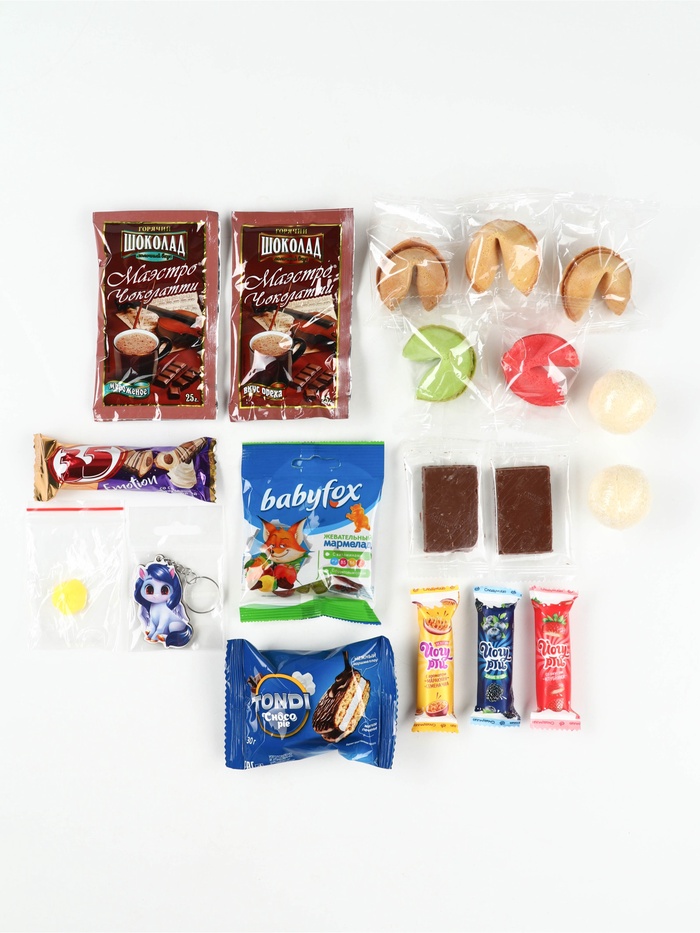 Cостав: сахар, мука пшеничная хлебопекарная, глюкозный сироп, масла растительные, заменитель молочного жира (масла растительные, антиокислитель: токоферолы, концентрат смеси), декстроза моногидрат, влагоудерживающий агент – сорбитовый сироп, какао-порошок, комплексная пищевая добавка (рисовая мука, эмульгатор – эфиры полиглицерина и жирных кислот), сыворотка молочная сухая, сухое цельное молоко, разрыхлители: гидрокарбонат натрия, гидрокарбонат аммония, Е341(i); желатин, продукты яичные, соль, эмульгаторы: лецитины соевые, Е476, Е492; какао тёртое, белок соевый, ароматизаторы, антиокислители: токоферолы, концентрат смеси, лимонная кислота. Возможно наличие диоксида серы, продуктов переработки фундука.