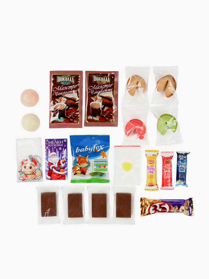 Габариты: 25,5 x 5,2 x 41 Страна: Россия В боксе: 15 шт Состав: См. на упаковке Материалы: см. на упаковке Фасовка: по 1 шт Индивидуальная упаковка: Термоусадочная пленка Сертификат: ЕАС Набор: Да Цвет: Сиреневый Для кого: Для девочки, Для мальчика В наборе, шт.: 12 Вес нетто, г: 180 Вид упаковки: Коробка картонная Символ года: Символ года 2026 (Лошадь) Тематика праздника: Новый год Адресат: Без адресата Составляющие набора: Конфеты, Карандаши, Шоколад, Печенье, Игрушка-антистресс, Бомбочка для ванн Возраст: Для детей Фиксированная цена: Да ПРИ ОФОРМЛЕНИИ ЗАКАЗА, ПРОСИМ ЗАПРАШИВАТЬ АКТУАЛЬНЫЕ СРОКИ ГОДНОСТИ У МЕНЕДЖЕРА Конфеты глазированные с корпусами по типу пралине «Йогурти» Состав: сахар, жир специального назначения (рафинированные дезодорированные растительные масла (кокосовое, модифицированное пальмоядровое), глазурь кондитерская (сахар, заменитель масла какао нетемперируемый лауринового типа (рафинированное дезодорированное гидрогенизированное фракционированное пальмоядровое масло, эмульгаторы: сорбитан тристеарат, соевый лецитин), сыворотка молочная сухая, эмульгатор Е476, ароматизаторы, соль), сыворотка молочная сухая, мальтодекстрин, молоко сухое цельное, молоко сухое обезжиренное, сливки сухие (сливки питьевые пастеризованные, молоко обезжиренное), йогурт сухой обезжиренный (молоко восстановленное из сухого обезжиренного молока, заквасочная культура на основе Streptococcus salivarius ssp. thermophilus, lactobacillus delbrueckii ssp. bulgaricus), стабилизатор – цитрат кальция, семена чиа, регулятор кислотности Е330, комплексная пищевая добавка – краситель (масло растительное (подсолнечное), красители Е120, Е160а, антиокислитель Е307), ароматизаторы. Продукт содержит лецитин соевый, молочные продукты. Возможно наличие следов глютена, арахиса, яичных продуктов. Мучное кондитерское изделие глазированное «Tondi Choco Pie» Cостав: сахар, мука пшеничная хлебопекарная, глюкозный сироп, масла растительные, заменитель молочного жира (масла растительные, антиокислитель: токоферолы, концентрат смеси), декстроза моногидрат, влагоудерживающий агент – сорбитовый сироп, какао-порошок, комплексная пищевая добавка (рисовая мука, эмульгатор – эфиры полиглицерина и жирных кислот), сыворотка молочная сухая, сухое цельное молоко, разрыхлители: гидрокарбонат натрия, гидрокарбонат аммония, Е341(i); желатин, продукты яичные, соль, эмульгаторы: лецитины соевые, Е476, Е492; какао тёртое, белок соевый, ароматизаторы, антиокислители: токоферолы, концентрат смеси, лимонная кислота. Возможно наличие диоксида серы, продуктов переработки фундука. Жевательный мармелад: ассорти вкусов с витаминами Состав: глюкозно-фруктозный сироп, сахар, желатин, регулятор кислотности – лимонная кислота, концентрированные соки: яблочный, вишнёвый, апельсиновый, клубничный, лимонный, чёрной смородины, чёрной моркови; агент желирующий – пектины, глазирователь – воск карнаубский, ароматизаторы, красители: каротины, куркумин, синий блестящий FCF; витамины: С, В6, ниацин, пантотеновая кислота, фолацин. Может содержать консервант – диоксид серы. Конфеты «35» со сливочной начинкой Состав: масла растительные, в том числе соевое, сахар, мука пшеничная, сыворотка молочная сухая, молоко сухое обезжиренное, продукты сухие экструзионной технологии «Рис воздушный» (мука рисовая, крупа кукурузная, мука пшеничная, какао-порошок, соль, красит