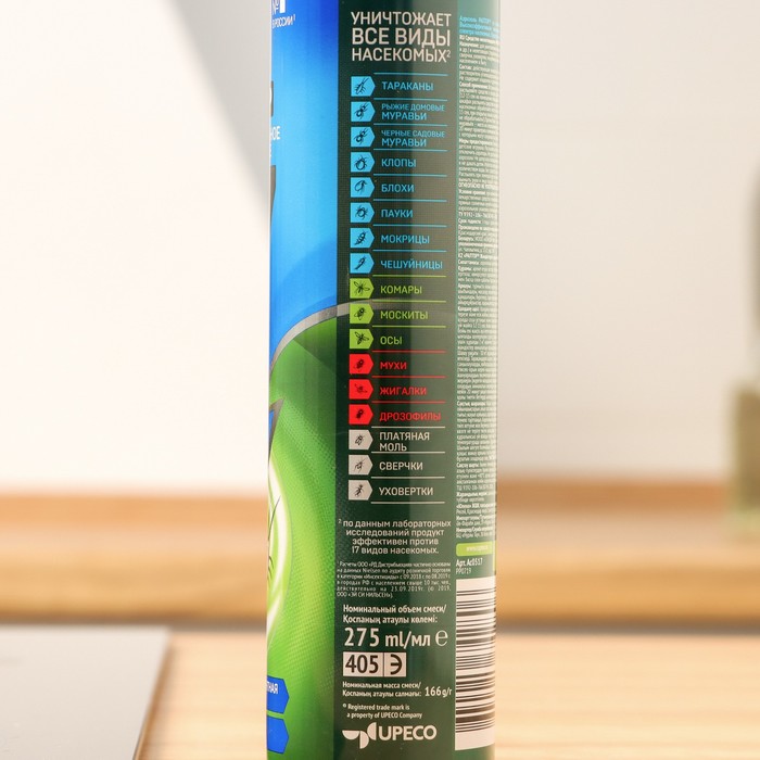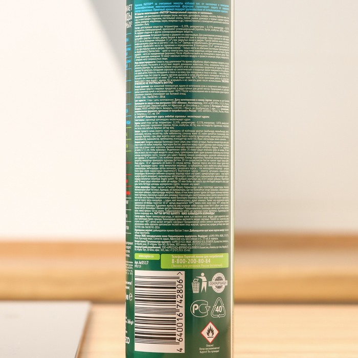 Универсальный аэрозоль Раптор – эффективное средство защиты от семнадцати видов ползающих и летающих насекомых. Благодаря трем сильным инсектицидам в составе оно не дает возможности для вредителей адаптироваться и выработать иммунитет, оставаясь одинаково действенным от обработки к обработке. Клопы, блохи, тараканы, мухи, муравьи, осы и пауки надолго покинут ваш дом, если обработать его укромные места спреем Раптор. Мощная струя и широкий охват распылителя позволяет проникнуть препарату в самые труднодоступные места. Средство наносится легко и действует мгновенно. Оно не токсично и не оставляет следов и пятен на поверхностях. Наилучших результатов от применения аэрозоля можно добиться, распыляя средство во всех помещениях, где обнаружены насекомые, одновременно. Повторную обработку для закрепления эффекта следует провести через месяц.Состав Средство отличается уникальным составом, в котором присутствуют три сильнодействующих инсектицида: тетраметрин – 0,20%; циперметрин – 0,15%, имипротрин – 0,05%. Вспомогательными веществами являются: растворитель углеводородный; пропеллент углеводородный (пропан, бутан, изобутан, 60 %), ароматическая отдушка. Спрей не содержит хладонов и озоноразрушающих компонентов.Способ применения Перед применением следует снять защитный пластиковый колпачок, хорошо встряхнуть баллон. Удерживая его вертикально на вытянутой руке, распылите аэрозоль с расстояния в 20 см на места передвижения, скопления или потенциального обитания насекомых. Уделите особое внимание таким зонам: щели в стенах и полу, зазоры за плинтусами и дверными коробками, под подоконниками, задние поверхности мебели, картин, ковры и подстилки для животных, санузлы, мусоропроводы, вентиляционные отверстия, вдоль трубопровода и канализационных труб. Распыляйте в течение 15 секунд. Через 15 минут после обработки помещения, его следует проветрить не менее 30 минут.