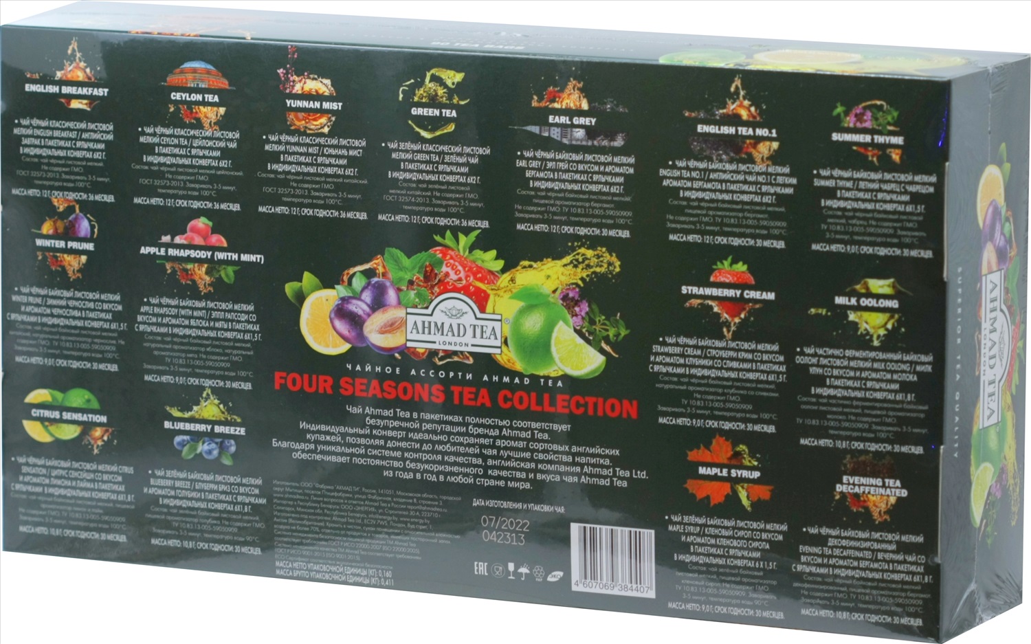 Фольгированные саше идеально сохраняют аромат купажей, позволяя донести до любителей чая лучшие качества напитка (15 вкусов по 6 пакетиков).В состав ассорти "Четыре сезона" вошли чаи: Английский завтракЧерный цейлонский чайЗимний черносливЦитрусовая сенсацияЧерничный бризЯблоко-мятаЮньнань МистКлассический зеленыйЭрл ГрейКлубничный кремКленовый сиропДекофеинизированный чайМолочный улунАнглийский чай No. 1Летний ЧабрецОтличный подарок на любой праздник!