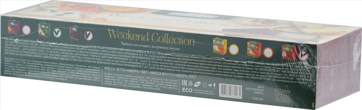 Ассорти листового чая в пирамидках (3 вкуса):1. Вкус композиции Клубничный Мусс Ahmad Tea открывает новые грани совершенства чая: благородный китайский зеленый чай раскрывается в букет с душистым клубничным ароматом и нотой мятной свежести.2. Вкус сладкой груши, теплая нотка корицы и отборный цейлонский чай в сочетании с чаем Ассам собраны в десертный шедевр Ahmad Tea Грушевый Штрудель. 3. Шоколадный Брауни от Ahmad Tea — это изысканный вкус темного шоколада в сочетании с терпким черным чаем провинции Ассам и утонченным цейлонским чаем. Отличный подарок на любой праздник! Приятного чаепития!