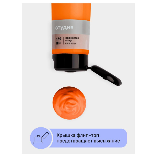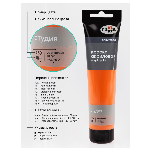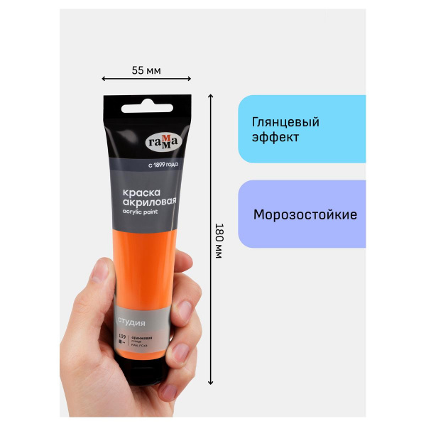 Акриловая краска «ГАММА» серии «Студия» оранжевая предназначена для художественно-живописных и декоративно-прикладных работ. Главные отличия: насыщенный цвет, густая консистенция, высокая адгезия, прочность красочного слоя. После высыхания краска становится глянцевой, практически не темнеет, специальная добавка позволяет максимально раскрыть красоту цвета. Художественный акрил прекрасно разносится, подходит для бумаги, картона, грунтованного холста, дерева, стекла, кожи, ткани. Время высыхания: от 10 минут до 1 часа в зависимости от толщины слоя. Прозрачный корпус тубы позволяет увидеть цвет краски, а удобная крышка флип-топ предотвращает высыхание. Объём тубы — 110 мл.