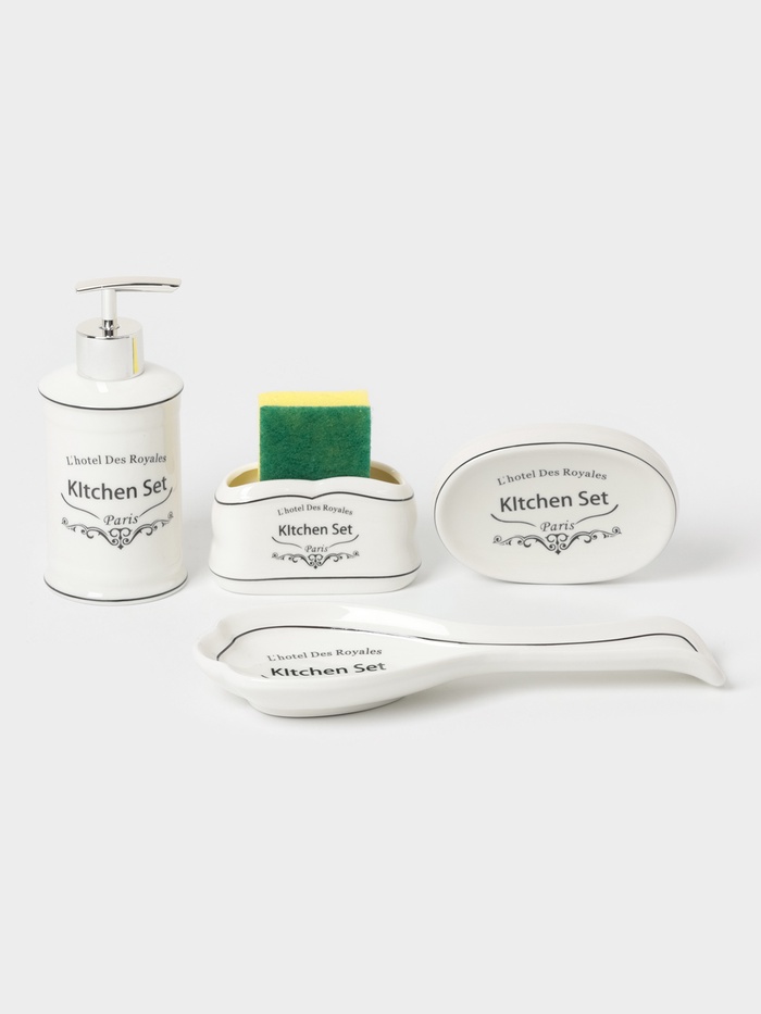 Комплектация1. Подставка для губки - 1 шт 2. Мыльница - 1 шт 3. Дозатор 300 мл - 1 шт 4. Подставка для ложки- 1 шт ДополнительноВ связи с особенностями производства керамических изделий допускается незначительное количество вкраплений (около 1 мм) и непрокрас на небольших участках. Это не влияет на потребительские свойства товара. Комментарии к товару