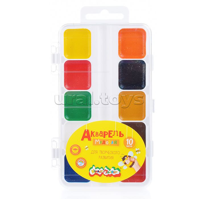 Код: 244730 Страна производитель: Россия Размеры упаковки: 17 x 9 x 2 см Количество в коробке: 12 • Набор акварельных красок 10 цветов в удобной пластиковой упаковке с европодвесом. • Благодаря улучшенному составу красок, они отличаются прозрачностью, чистотой и яркостью цвета. • Краски хорошо берутся на кисть, равномерно и легко наносятся на бумагу. • Идеально подходит в качестве первого материала для рисования, развивает воображение и способствует изучению цвета. • Изготовлены на основе натуральных компонентов с добавлением меда, поэтому абсолютно безопасны в использовании. • Товар соответствует требованиям безопасности продукции. • Для детей от 3-х лет. Комментарии к товару