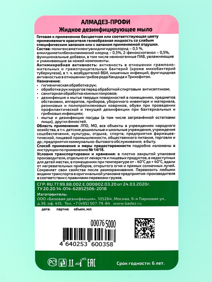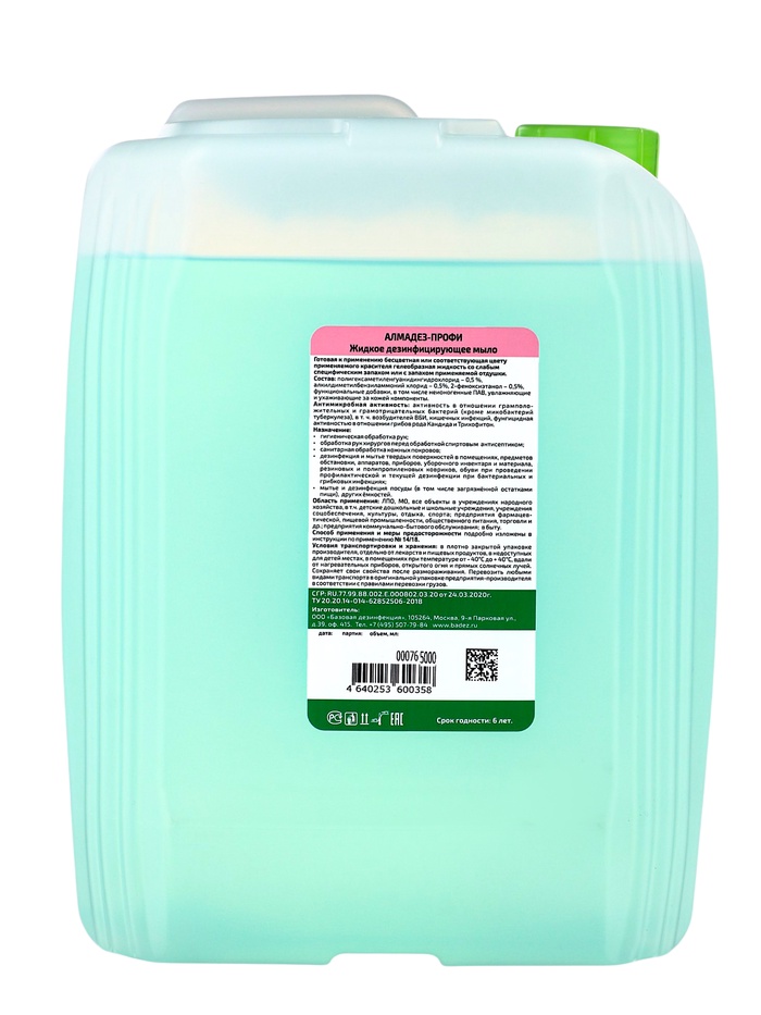 Габариты: 19 x 15 x 24 Доставка: Платная Страна: Россия В боксе: 4 шт Состав: См. на упаковке Материалы: см. на упаковке Фасовка: по 1 шт Индивидуальная упаковка: Без упаковки Сертификат: СТР Вес, г/Объём, мл: 5000 Область применения: Для тела Тип: Жидкое Вид мыла: Антибактериальное Назначение: Профессиональные Вид: Поверхностно-активное вещество (ПАВ) Алмадез-Профи — современное универсальное средство для дезинфекции и очистки различных поверхностей. Формула на основе безопасных компонентов эффективно уничтожает широкий спектр бактерий, вирусов и грибков, при этом не повреждает материалы и не оставляет резкого запаха. Подходит для применения в медучреждениях, образовательных организациях, предприятиях общепита, фитнес-клубах, салонах красоты, а также в быту. Преимущества: Высокая антимикробная активность. Экономичный расход за счёт концентрированной формы. Подходит для обработки твёрдых и мягких поверхностей, а также предметов личной гигиены. Безопасен при правильном применении, не вызывает коррозии. Удобная канистра объёмом 5 л для профессионального и регулярного использования. Способ применения: Перед обработкой подготовьте рабочий раствор в нужной концентрации согласно инструкции (обычно 0,25–1% в зависимости от цели обработки). Нанесите средство с помощью распылителя, салфетки или губки на очищаемую поверхность. Оставьте на время экспозиции (от 5 до 30 минут, в зависимости от степени загрязнения и объекта обработки). При необходимости смойте чистой водой или протрите сухой тканью. Области использования: Дезинфекция мебели, дверных ручек, сантехники. Обработка медицинских инструментов (по согласованию с инструкцией). Санитарная обработка помещений с повышенными требованиями к гигиене. Применение в быту для профилактической уборки. Комментарии к товару
