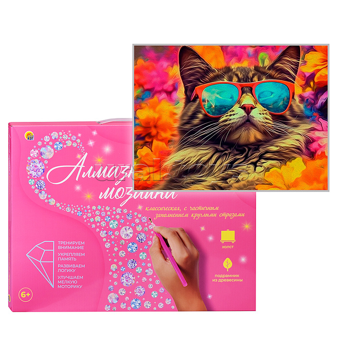 • В наборе: - картонная основа с клейкой основой. - разноцветные стразы. - контейнер для страз. - зип-пакеты для хранения страз 5 шт. - карандаш-стилус. - клеевая подушка. - схема. • Размеры холста: 17х22 см. • Материалы: пластик, дерево, металл, бумага. • Соответствует требованиям безопасности продукции. • Для детей от 6 лет.