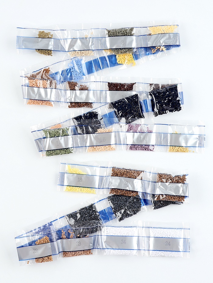 Вам предстоит разложить кристаллики карандашом по пронумерованной схеме. Холст с клеевым покрытием будет надёжно удерживать стразы.