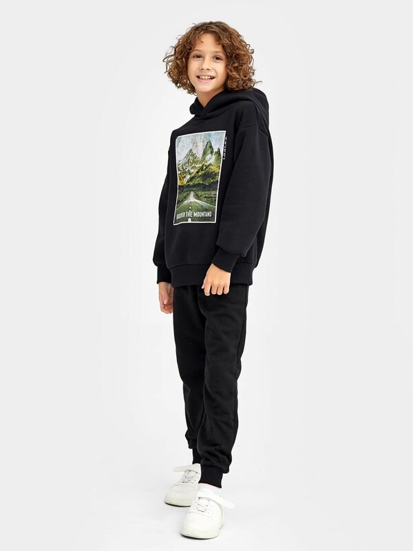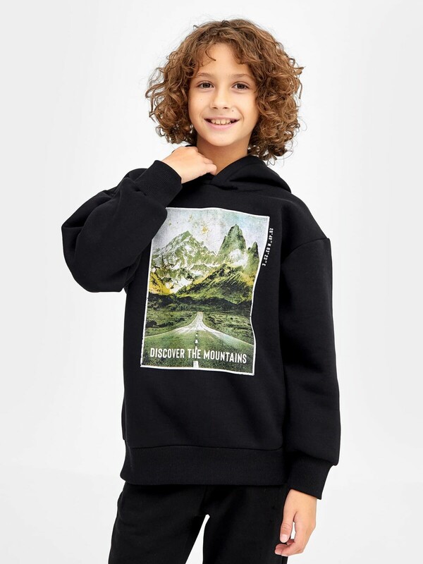 Анорак прямого силуэта с капюшоном. Линия плеча спущена. Рукава длинные, втачные. Горловина круглой формы. Капюшон на подкладке из кулирного полотна. В боковых швах полочки и спинки декоративные вставки из основного полотна. По низу изделия пояс из рибаны. По низу рукавов манжеты из рибаны.