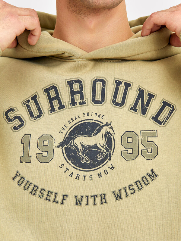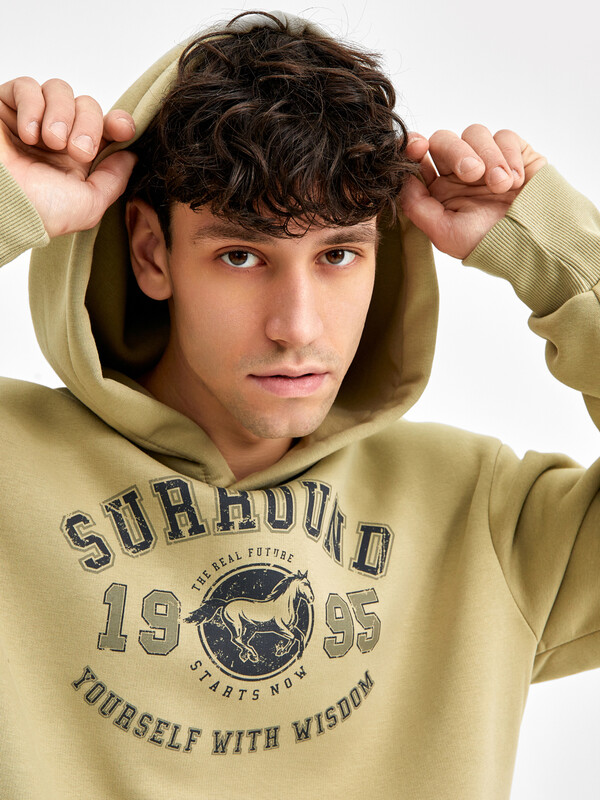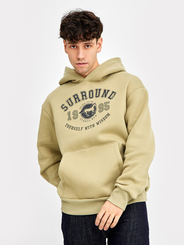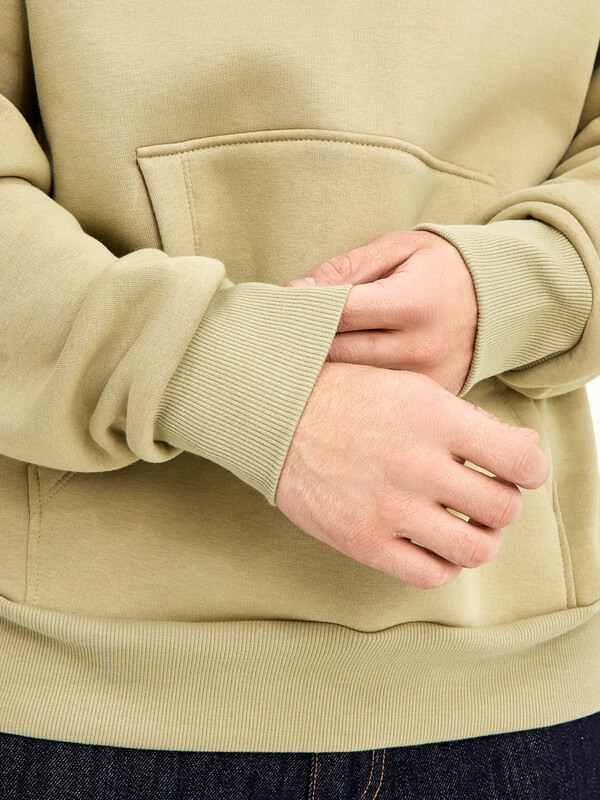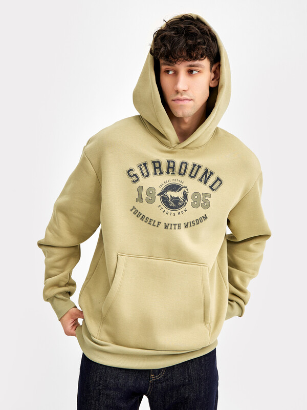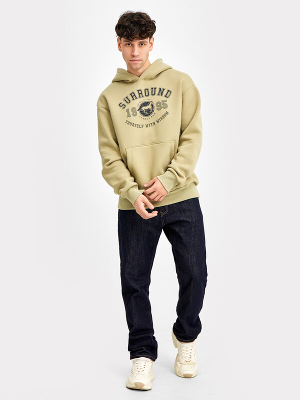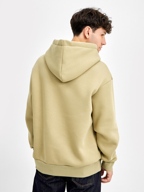 Мужское худи свободного силуэта из трикотажного футера с теплым подчесом. Круглая горловина с капюшоном, длинные рукава на манжетах, слегка спущенная линия плеча, пояс из рибаны – худи удачно сочетает комфортный дизайн и отличное качество!