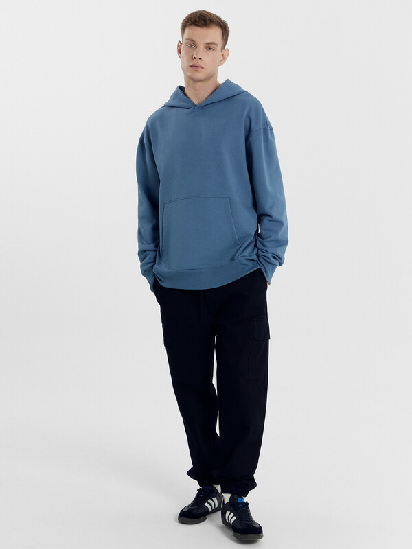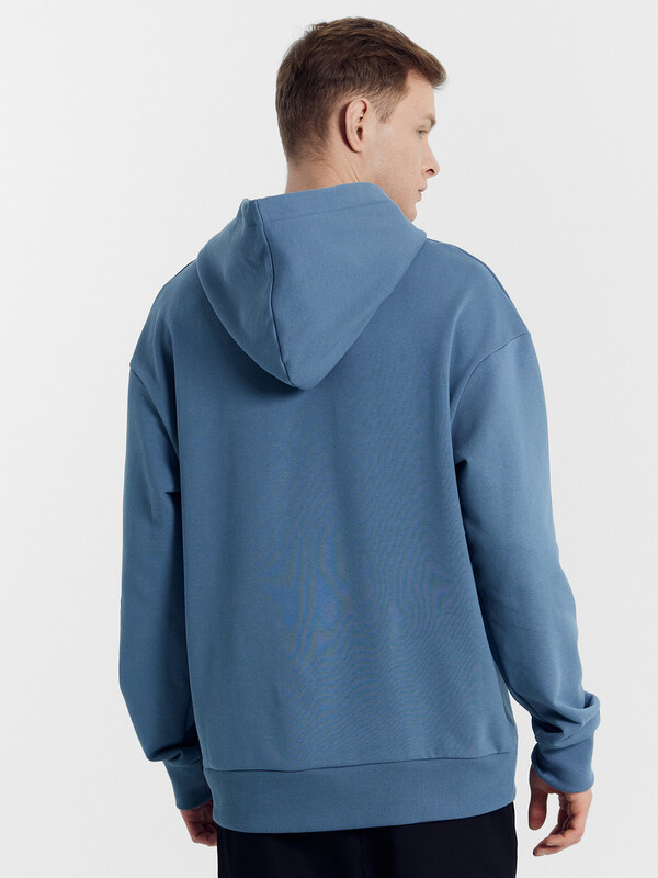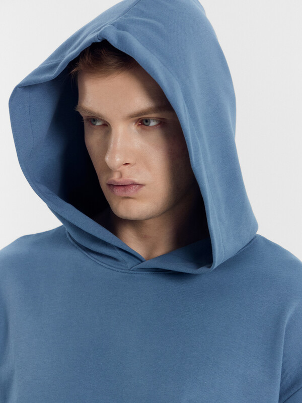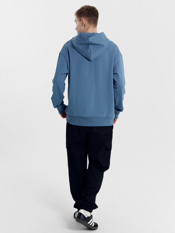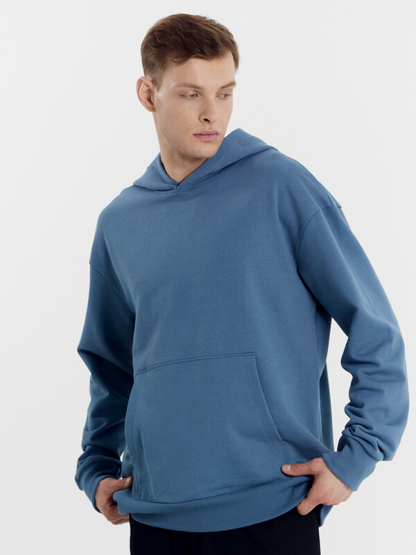 Мужское худи свободного силуэта из трикотажного футера с теплым подчесом. Круглая горловина с капюшоном, длинные рукава на манжетах, слегка спущенная линия плеча, пояс из рибаны – худи удачно сочетает комфортный дизайн и отличное качество!
