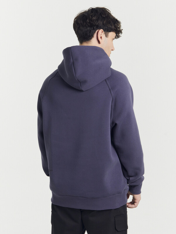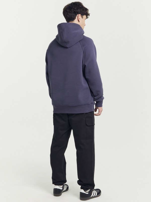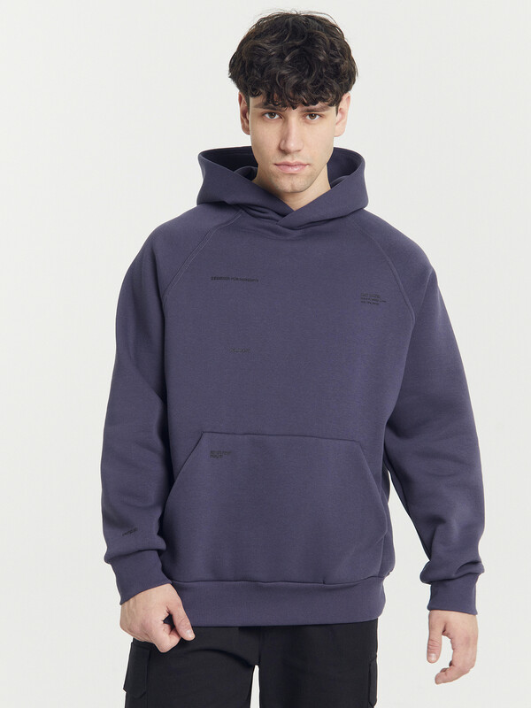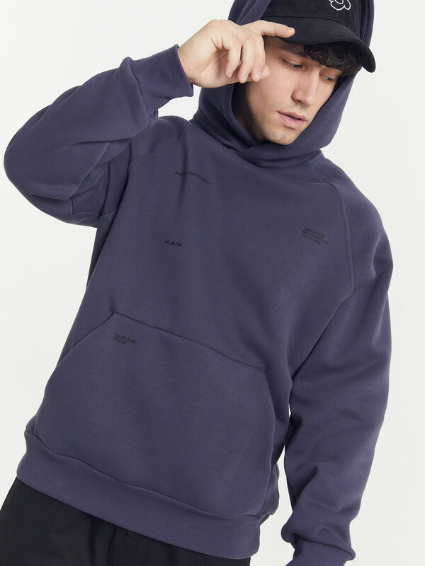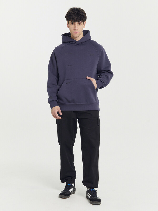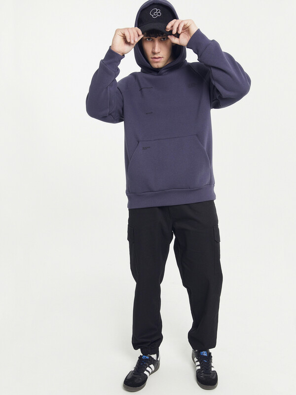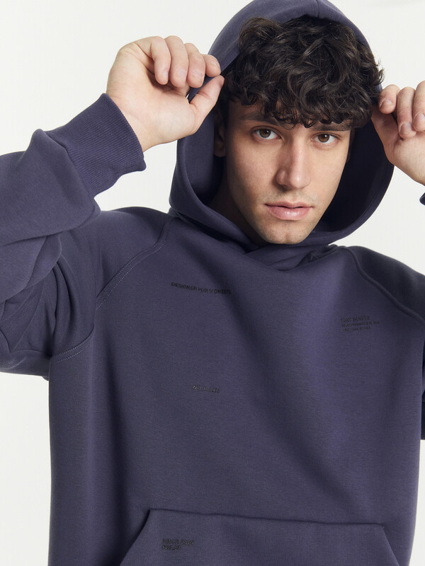 Мужское худи из трикотажного футера с теплым и нежным подчесом. Силуэт свободный, оверсайз. Вырез круглый, классический, с уютным капюшоном. Рукава свободные, с манжетами. Накладной карман-кенгуру и эластичный пояс из рибаны делают худи еще более уютным.