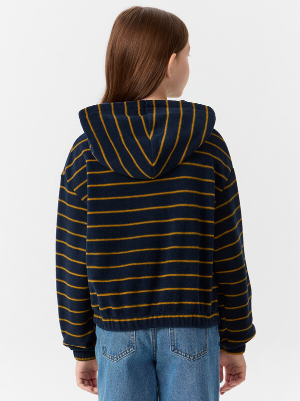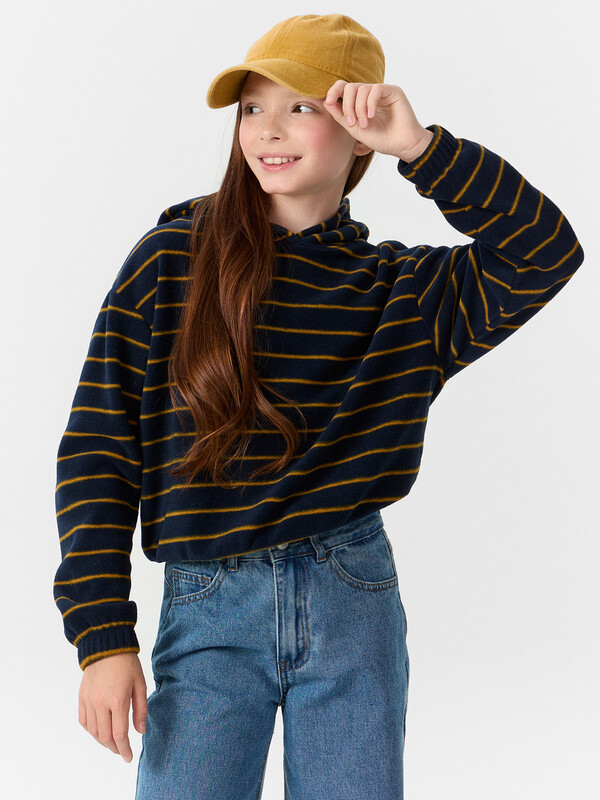 Укороченный анорак из флиса. Силуэт свободный, пройма спущена. Рукава длинные, втачные. Горловина круглой формы, втачан капюшон. По низу изделия и низу рукавов застрочена эластичная тесьма.