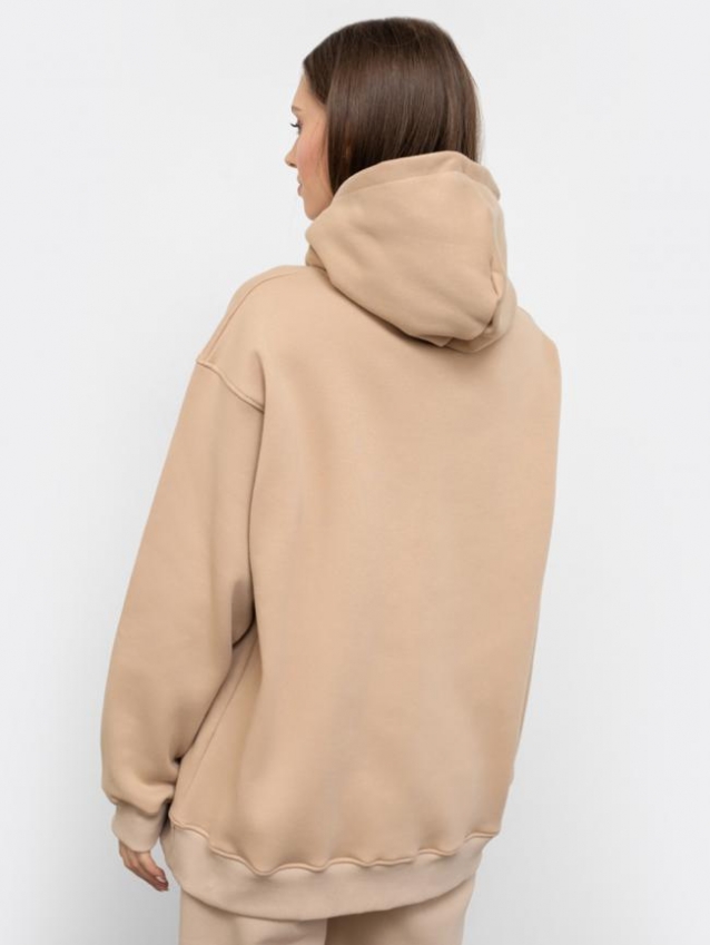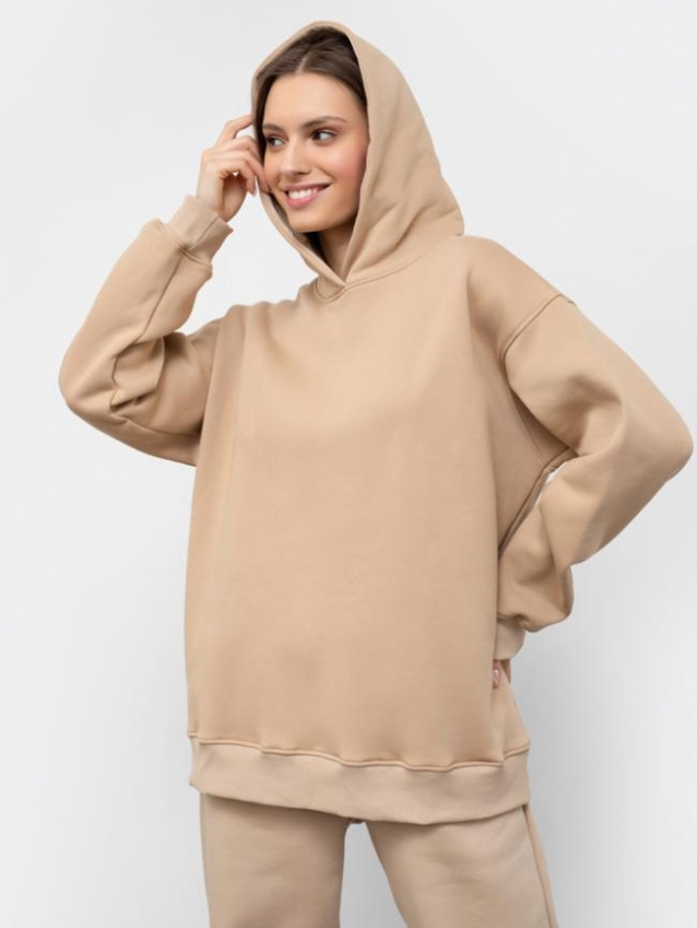 Худи силуэта оверсайз из футера с теплым подчесом нежного и долговечного трикотажного полотна. Уютный капюшон пригодится в прохладную погоду. Полнота движений сохраняется благодаря спущенной линии плеча и углубленной пройме. Длинные широкие рукава на манжетах. Актуально, стильно, удобно!