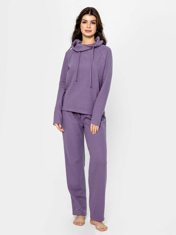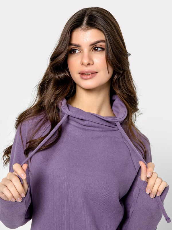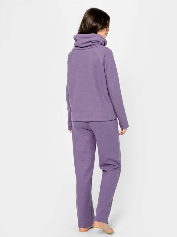 Домашний джемпер прямого силуэта из трикотажного полотна. Длинные рукава "реглан". Круглая горловина с уютным воротником и длинными шнурками-завязками.