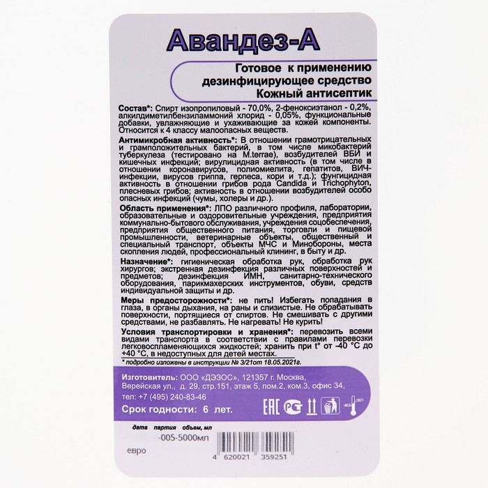 Габариты: 24,5 x 18,5 x 25,5 Доставка: Платная Страна: Россия В боксе: 3 шт Состав: См. на упаковке Материалы: см. на упаковке Фасовка: по 1 шт Индивидуальная упаковка: Без упаковки Сертификат: РСТ Объём, мл: 5000 Вид: Антисептик Назначение: Бытовые На спиртовой основе: Да Вид средства: Гель Для дезинфекции небольших по площади и/или труднододоступных поверхностей и предметов, ИМН, для гигиенической обработки рук и обработки рук хирургов, обработки кожи инъекционного и операционного поля, локтевых сгибов доноров, санитаризации кожных покровов и обеззараживания СИЗ. Готовая к применению прозрачная бесцветная жидкость, обладающая бактерицидной, вирулицидной, туберкулоцидной и фунгицидной активностью, обеспечивающая быстрый и продолжительный антисептический эффект. Обладает пролонгированным действием. Не требует смывания. Полностью отвечает требованиям СанПин и ГОСТ. Относится к 4 классу мало опасных веществ. Способ использования: протирание, орошение, погружение, пропитывание блоков сухих салфеток. Состав: спирт изопропиловый – 70,0%, 2-феноксиэтанол – 0,2%, алкилдиметилбензиламмоний хлорид – 0,05%, а также функциональные добавки, увлажняющие и ухаживающие за кожей компоненты Комментарии к товару
