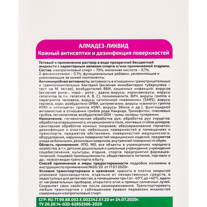 • Может использоваться для пропитывания на месте сухих салфеток, помещенных в Диспенсерную систему «Алмадез», и дальнейшего применения их для очистки и дезинфекции поверхностей методом протирания согласно утверждённой инструкции по применению.