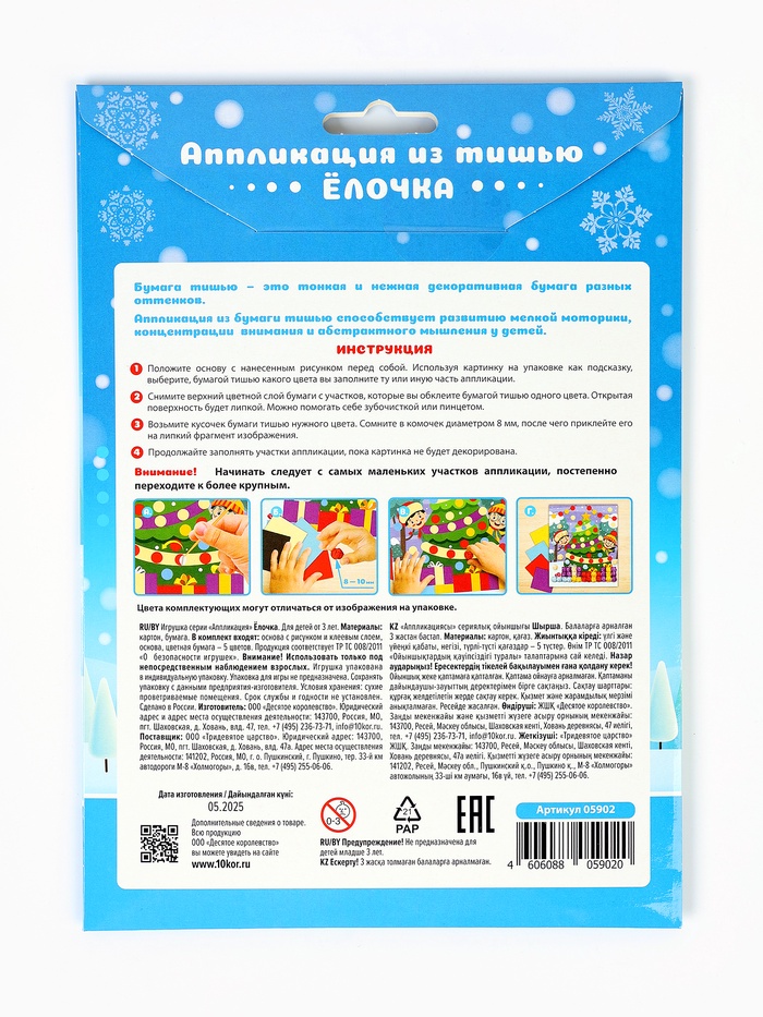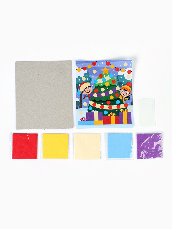 Аппликация из тишью — это увлекательный набор для творчества, предназначенный для детей от 3 лет. Он включает в себя цветные бумажные кружки, которые необходимо смять и приклеить на картонную основу с изображением новогодней ёлки. Результатом станет яркая и объёмная картинка, которая станет отличным украшением интерьера в преддверии праздников.