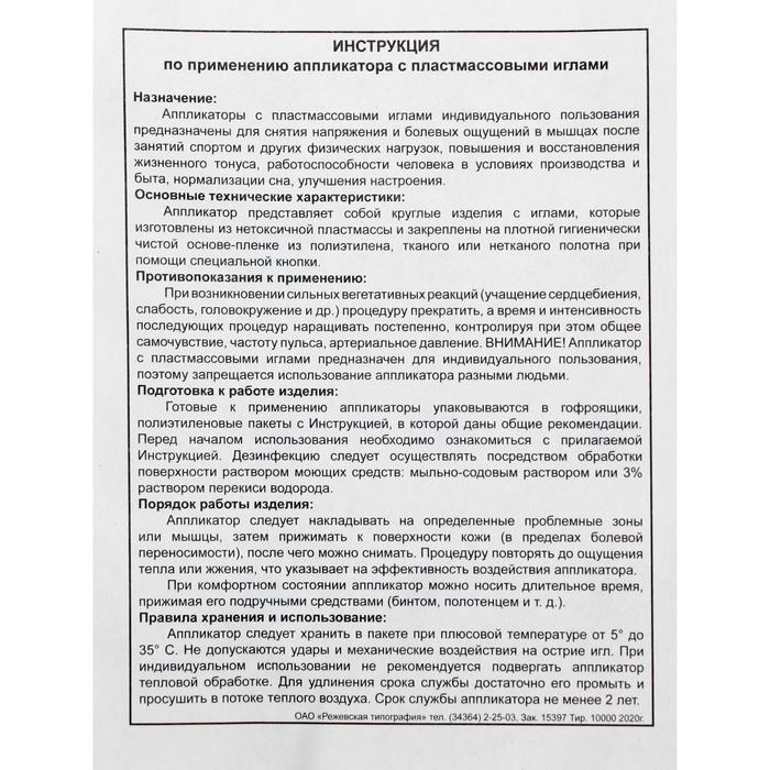 Ипликатор (Аппликатор) игольчатый может быть использован для: ускоренного восстановления работоспособности человека в условиях производства, быту, спорте.