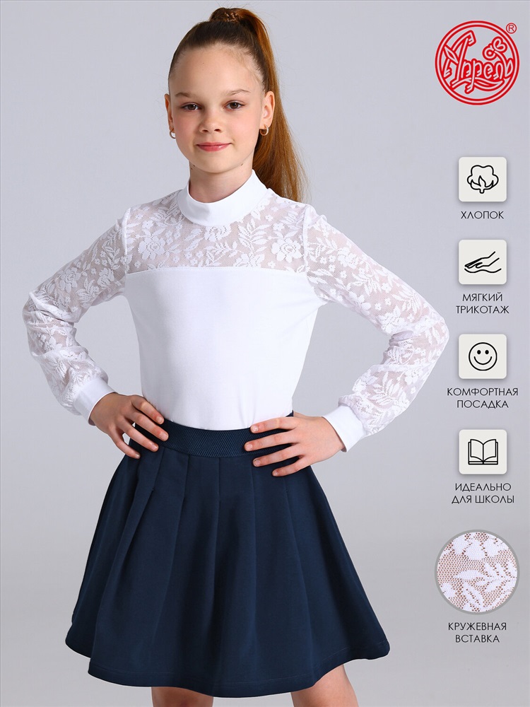 Блузка для девочки выполнена из кулира - легкого хлопкового полотна с лайкрой в сочетании с гипюром. Изделие полуприлегающего силуэта, с кокеткой и длинными рукавами на манжетах, Воротник-стойка. Уход: только машинная стирка (руками не стирать!) при температуре 40 градусов, без предварительного замачивания.