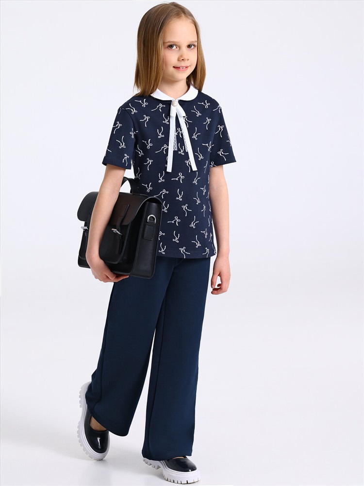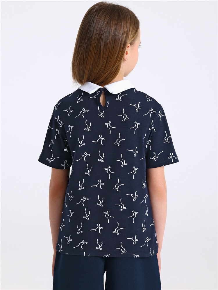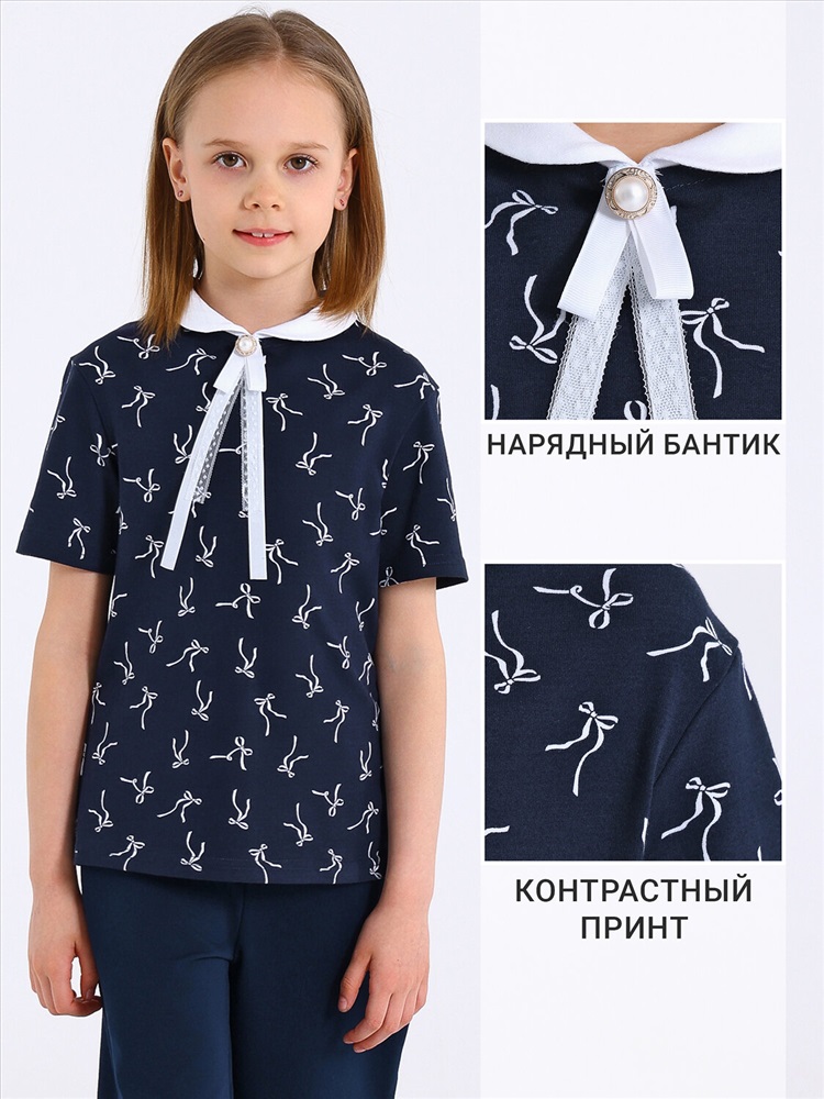 Блузка для девочки выполнена из кулира - легкого хлопкового набивного полотна с лайкрой. Изделие прямого силуэта с короткими рукавмами. Воротник отложной, дополнен декоративным бантом с пуговицей. На спинке застежка на пуговицу. Уход: только машинная стирка (руками не стирать!) при температуре 40 градусов, без предварительного замачивания.