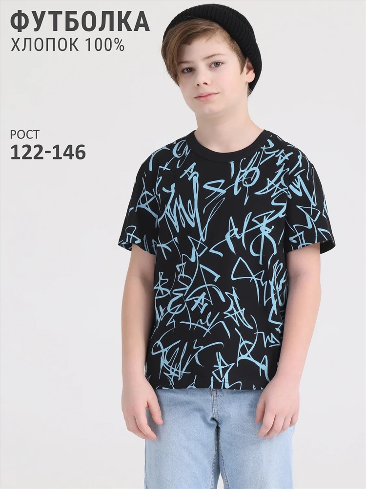 Футболка для мальчика выполнена из кулира – легкого хлопкового плотна. Изделие прямого силуэта и свободного кроя, с короткими рукавами со спущенной линией плеча, вырез горловины обработан эластичной бейкой из полотна компаньона. Футболка украшена яркой набивкой. Уход: только машинная стирка (руками не стирать!) при температуре 40 градусов, без предварительного замачивания.