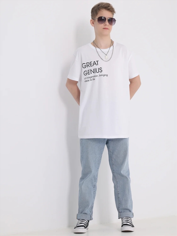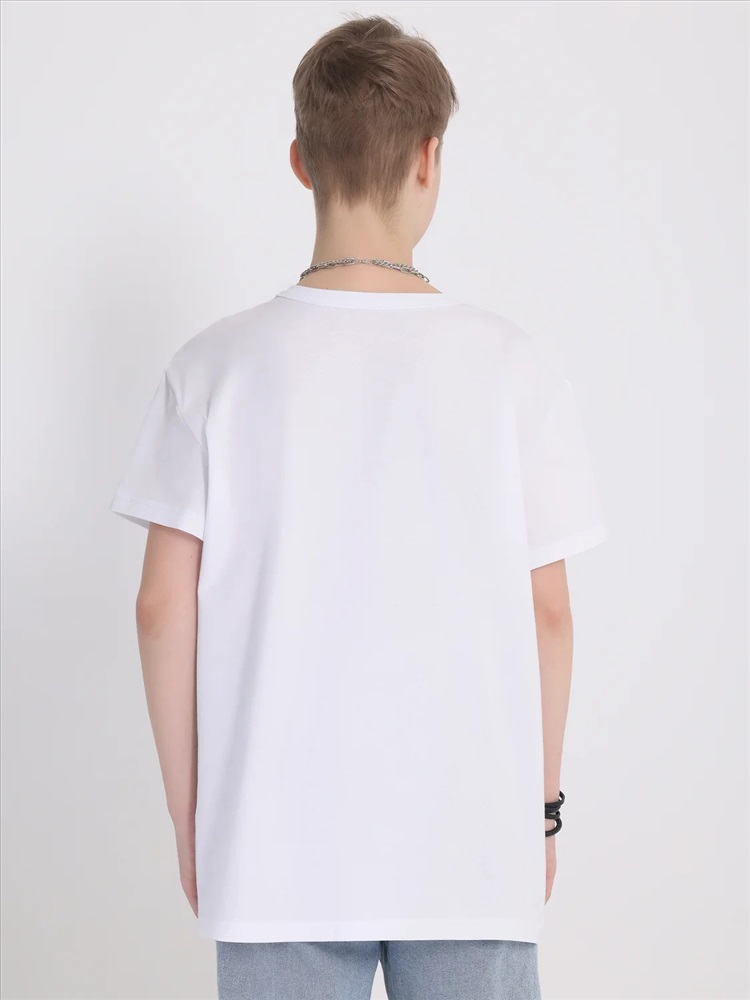 Оверсайз футболка для мальчика выполнена из кулира - легкого хлопкового полотна. Изделие прямого покроя с короткими рукавами и округлым вырезом горловины, украшено принтом. Уход: только машинная стирка (руками не стирать!) при температуре 40 градусов, без предварительного замачивания. Изделия с печатью или декором перед стиркой необходимо вывернуть на изнаночную сторону.