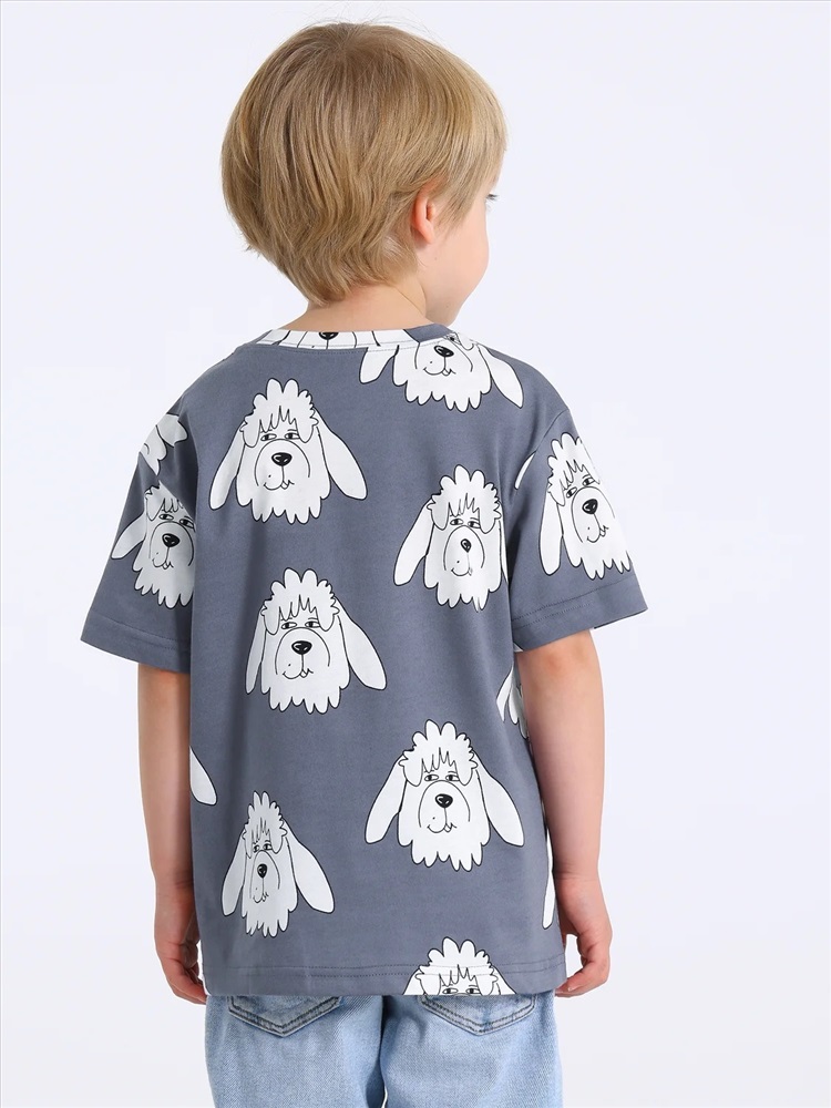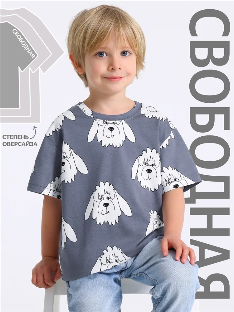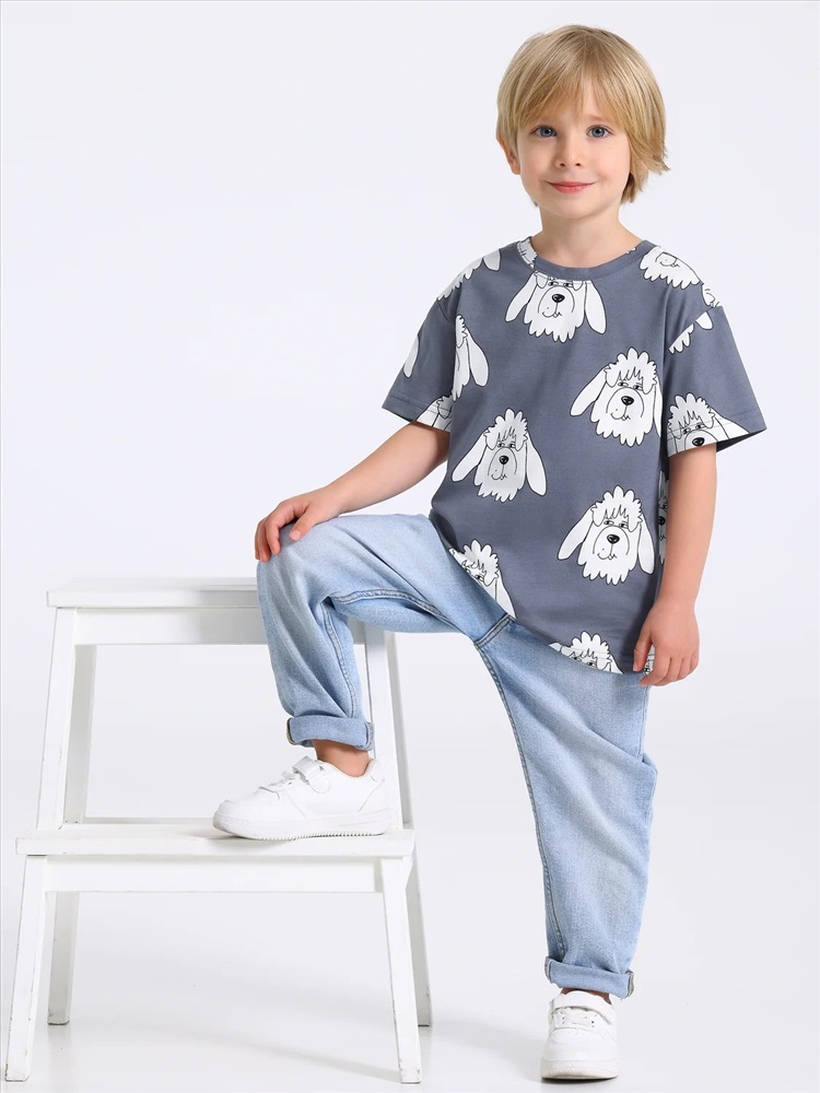 Футболка для мальчика выполнена из кулира - тонкого хлопкового набивного полотна. Изделие свободного покроя с круглым вырезом горловины и короткими рукавами со спущенной линией плеча. Уход: только машинная стирка (руками не стирать!) при температуре 40 градусов, без предварительного замачивания.