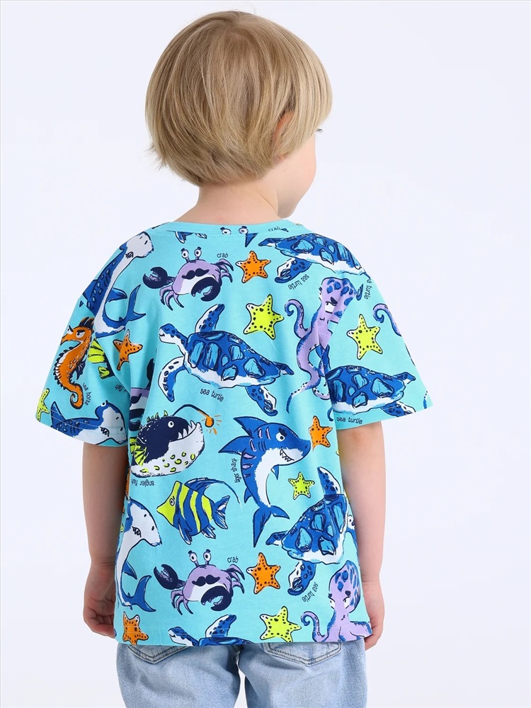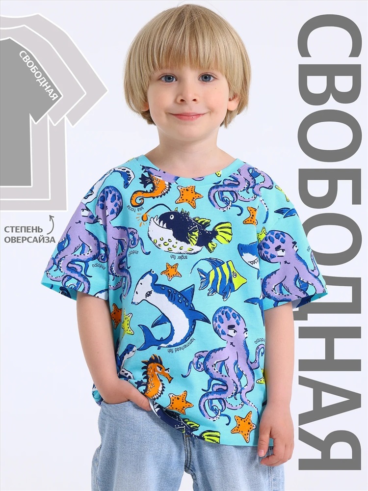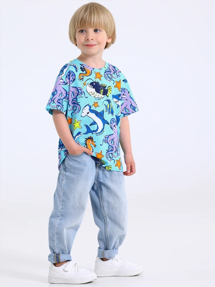 Футболка для мальчика выполнена из кулира - тонкого хлопкового набивного полотна. Изделие свободного покроя с круглым вырезом горловины и короткими рукавами со спущенной линией плеча. Уход: только машинная стирка (руками не стирать!) при температуре 40 градусов, без предварительного замачивания.
