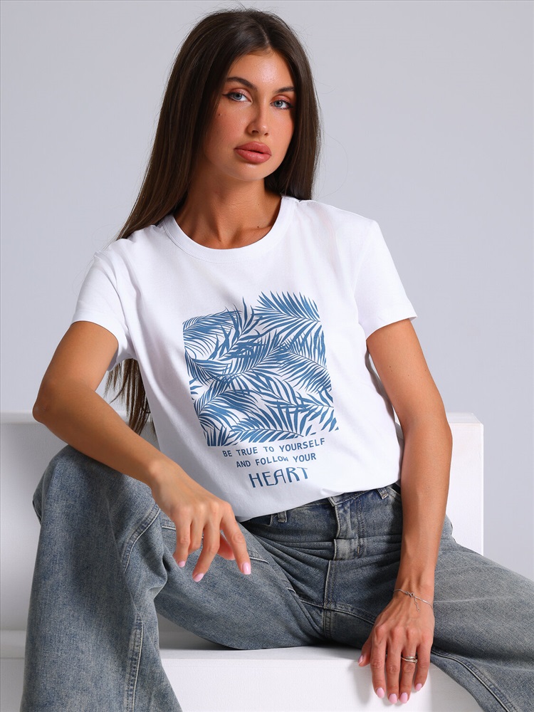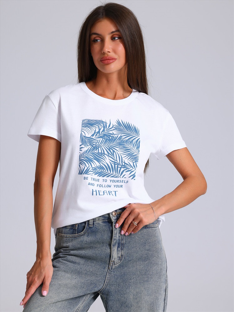 Футболка выполнена из кулира - легкого хлопкового полотна. Изделие свободного покроя с короткими рукавами и круглым вырезом горловины, украшено печатью. Уход: только машинная стирка (руками не стирать!) при температуре 40 градусов, без предварительного замачивания. Изделия с печатью перед стиркой необходимо вывернуть на изнаночную сторону.
