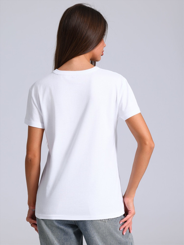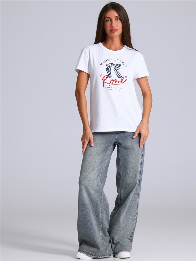 Футболка выполнена из кулира - легкого хлопкового полотна. Изделие свободного покроя с короткими рукавами и круглым вырезом горловины, украшено печатью. Уход: только машинная стирка (руками не стирать!) при температуре 40 градусов, без предварительного замачивания. Изделия с печатью перед стиркой необходимо вывернуть на изнаночную сторону.