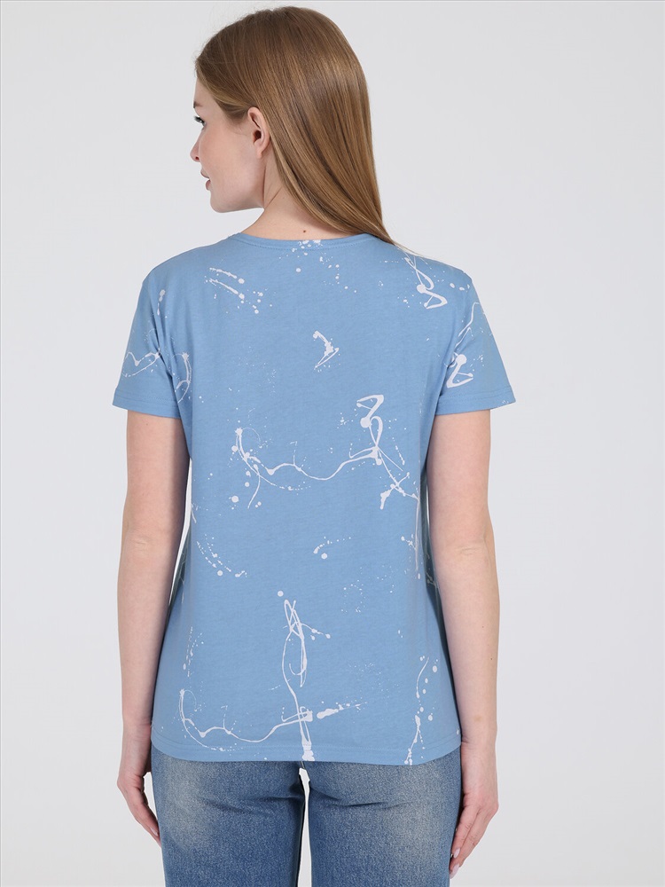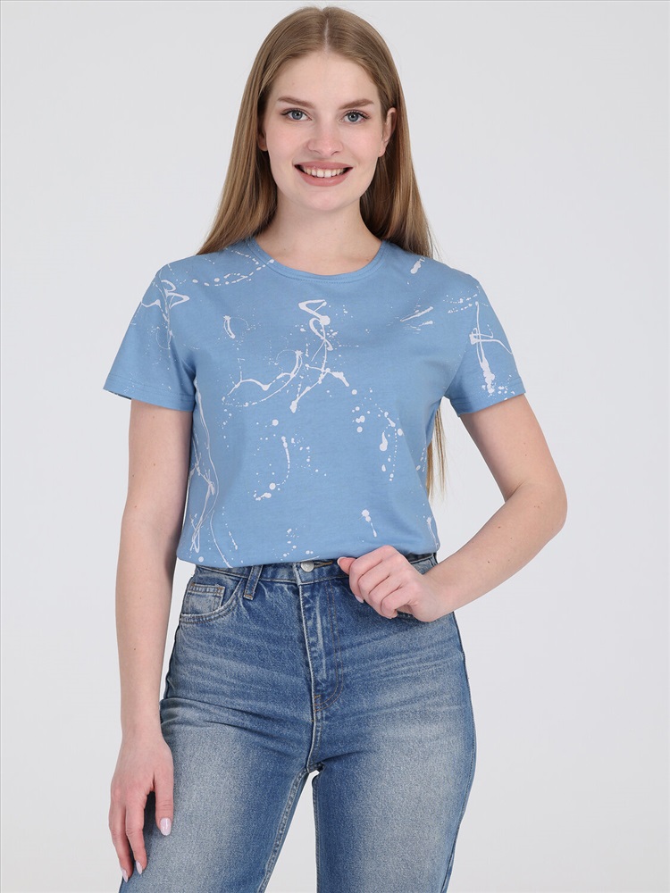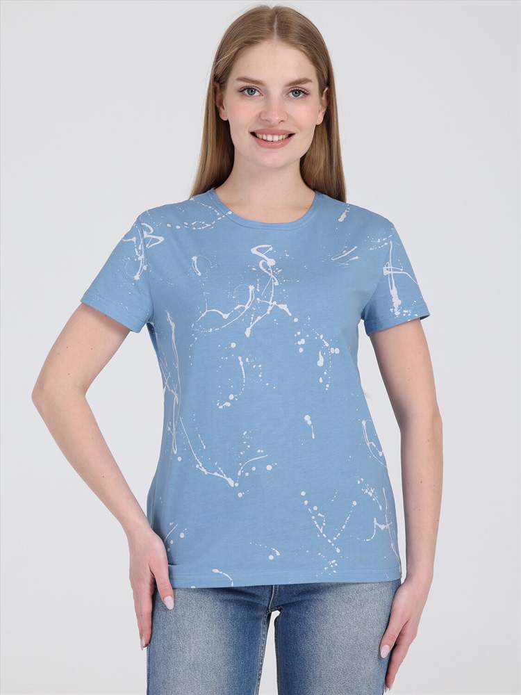 Футболка выполнена из кулира - легкого хлопкового полотна. Изделие свободного покроя с короткими рукавами и округлым вырезом горловины. Уход: только машинная стирка (руками не стирать!) при температуре 40 градусов, без предварительного замачивания.
