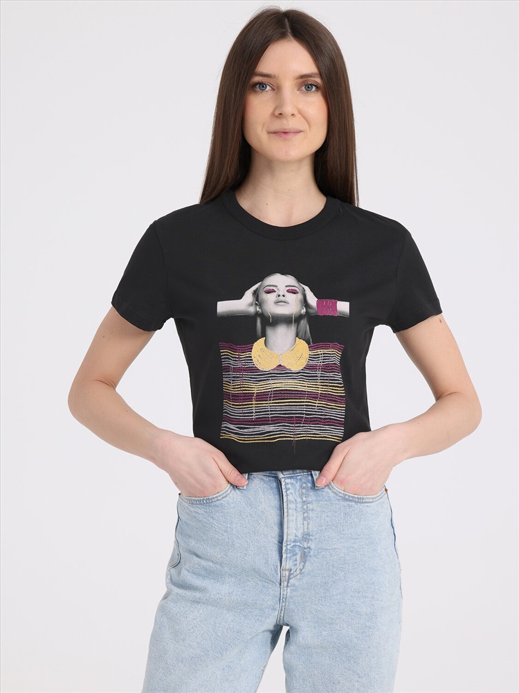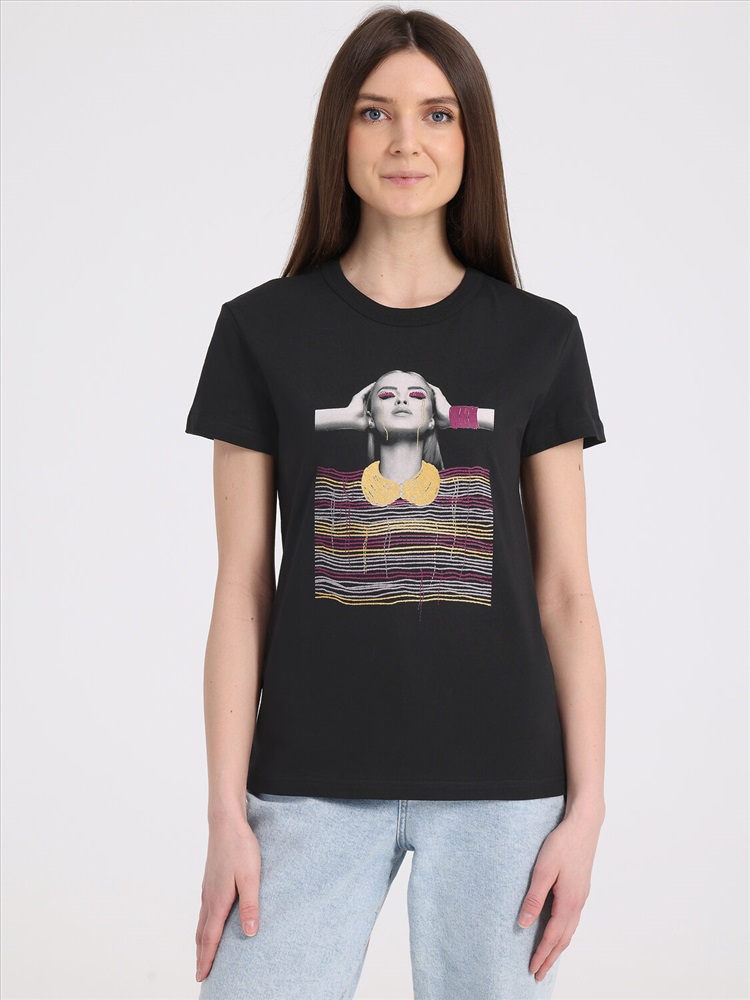 Футболка выполнена из легкого хлопкового полотна. Изделие свободного покроя с короткими рукавами и округлым вырезом горловины, украшено дизайнерским принтом. Уход: только машинная стирка (руками не стирать!) при температуре 40 градусов, без предварительного замачивания. Изделия с печатью перед стиркой необходимо вывернуть на изнаночную сторону.