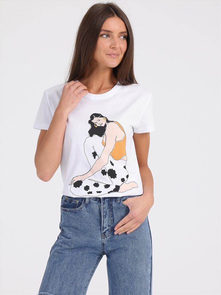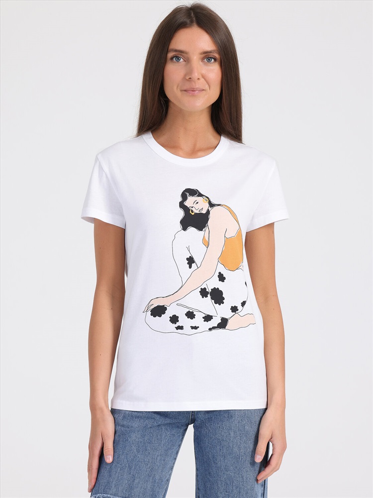 Футболка выполнена из кулира - легкого хлопкового полотна. Изделие свободного покроя с короткими рукавами и округлым вырезом горловины, украшено дизайнерским принтом. Уход: только машинная стирка (руками не стирать!) при температуре 40 градусов, без предварительного замачивания. Изделия с печатью перед стиркой необходимо вывернуть на изнаночную сторону.