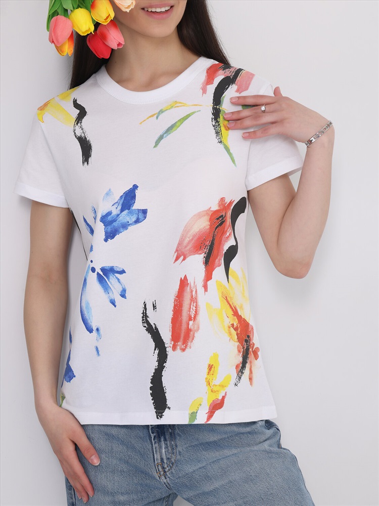 Футболка выполнена из кулира - легкого хлопкового полотна. Изделие свободного покроя с короткими рукавами и округлым вырезом горловины, украшено дизайнерским принтом. Уход: только машинная стирка (руками не стирать!) при температуре 40 градусов, без предварительного замачивания. Изделия с печатью перед стиркой необходимо вывернуть на изнаночную сторону.
