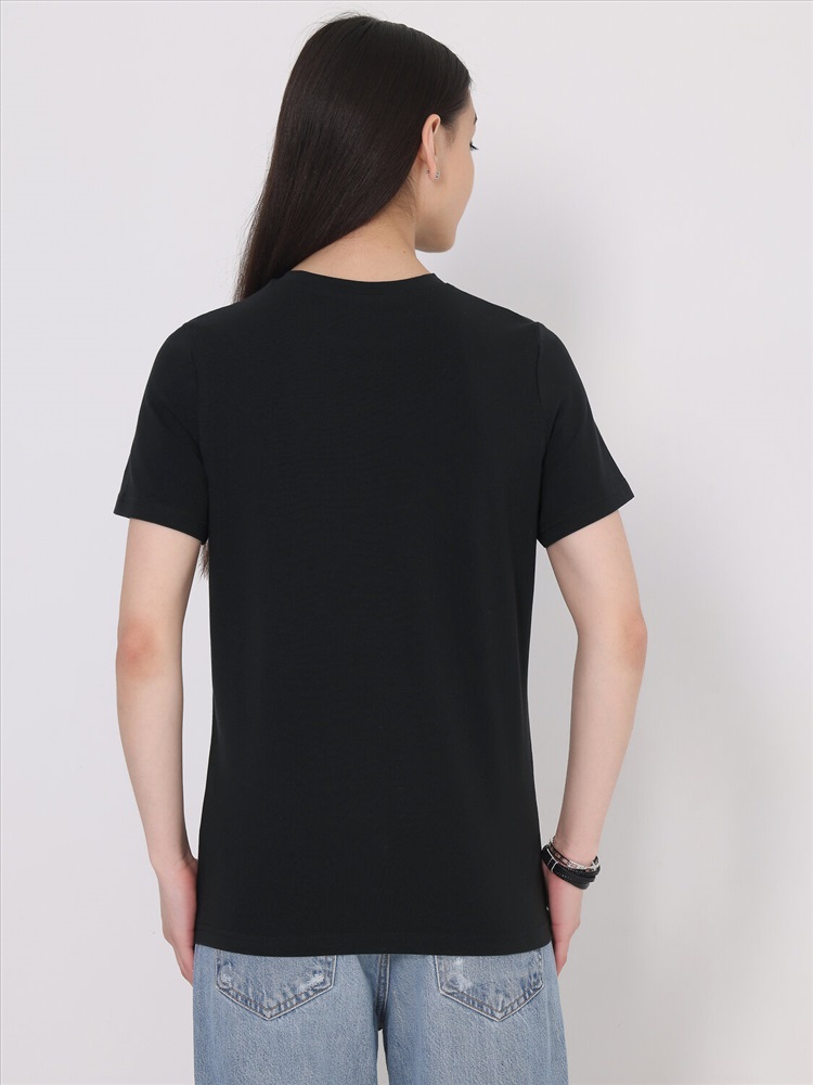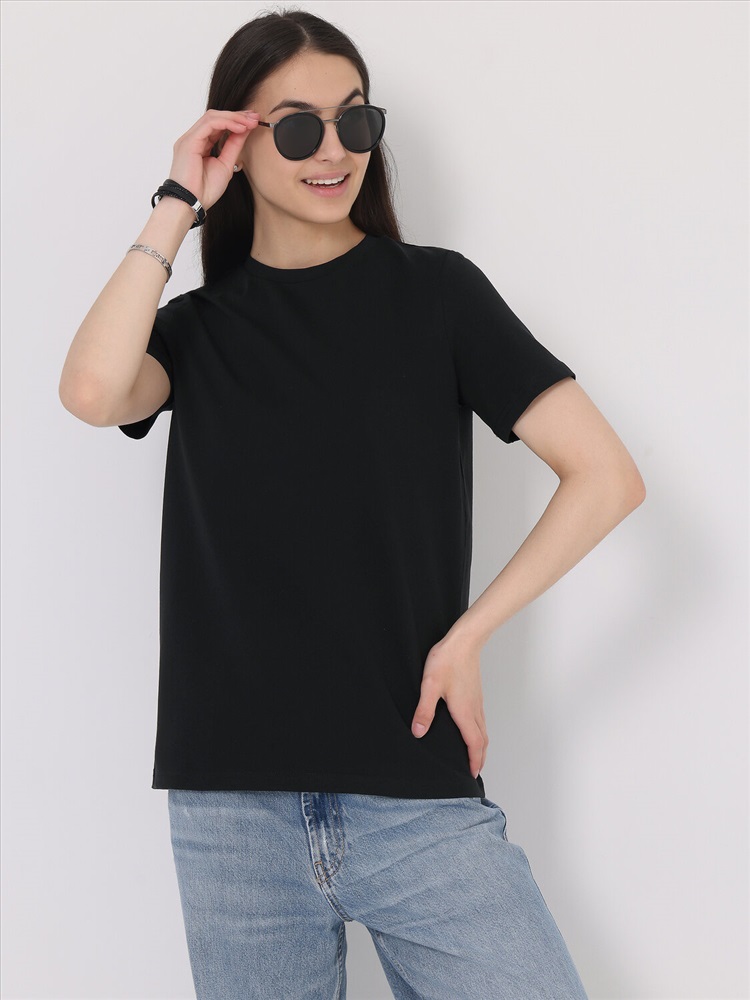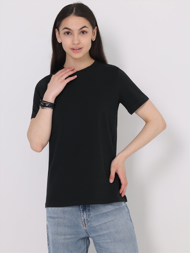 Футболка выполнена из кулира - легкого хлопкового полотна с лайкрой. Изделие свободного покроя с короткими рукавами и округлым вырезом горловины. Уход: только машинная стирка (руками не стирать!) при температуре 40 градусов, без предварительного замачивания.