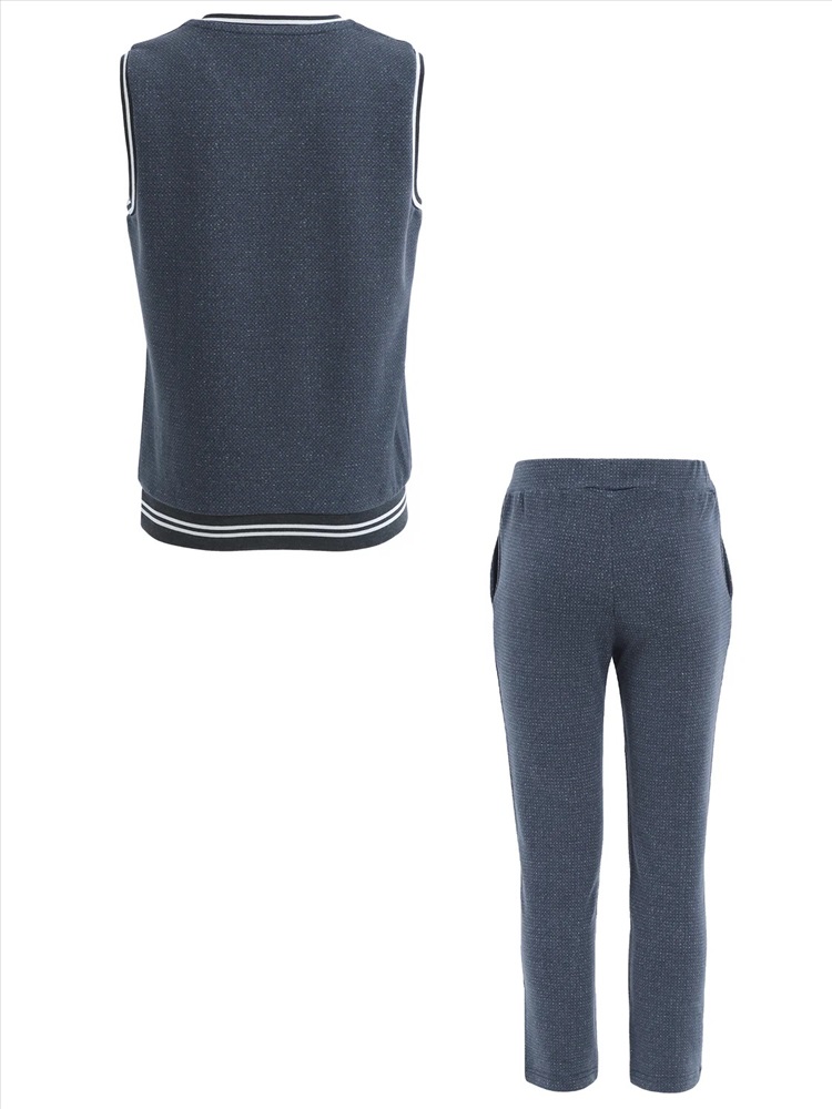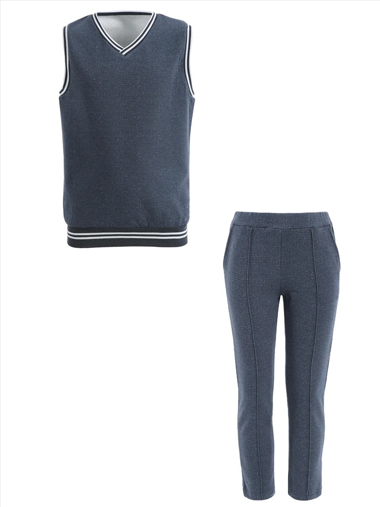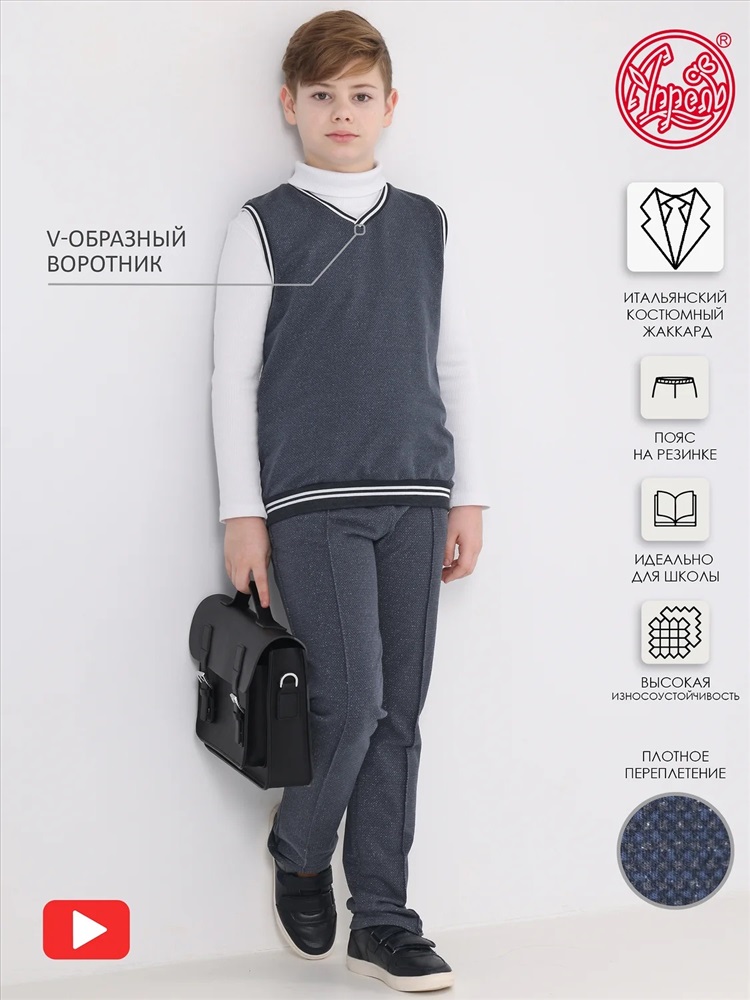 Стильный комплект из жилета и брюк выполнен из футера - плотного мягкого хлопкового полотна с лайкрой. Трикотажный жилет с V-образным вырезом и эластичной вставкой по низу изделия. Брюки средней посадки на эластичном поясе имеют втачные карманы и отстрочки-стрелки. Прекрасный вариант для школы. Уход: только машинная стирка (руками не стирать!) при температуре 40 градусов, без предварительного замачивания.