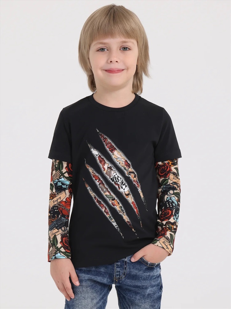 Стильный лонгслив для мальчика выполнен из кулира - тонкого хлопкового полотна с лайкрой. Изделие прямого покроя с округлым вырезом горловины и ярким принтом. Длинные рукава с эффектом 2в1 украшенные набивкой в виде татуировок не оставят равнодушными ни одного мальчишку! Уход: только машинная стирка (руками не стирать!) при температуре 40 градусов, без предварительного замачивания. Изделия с печатью и декором перед стиркой необходимо вывернуть на изнаночную сторону.