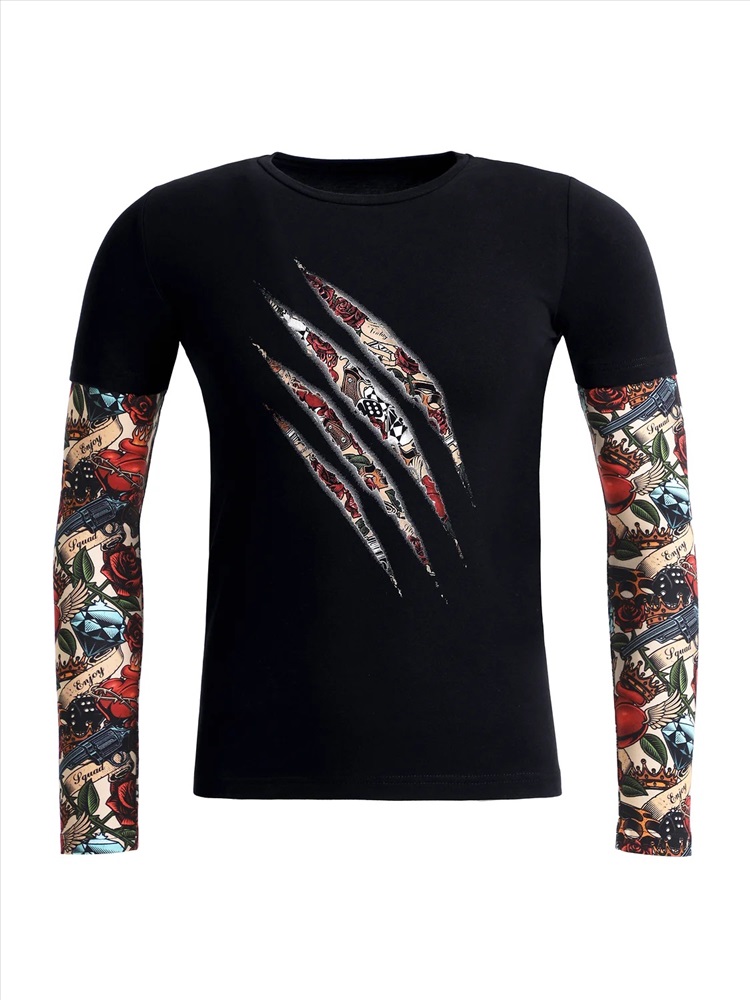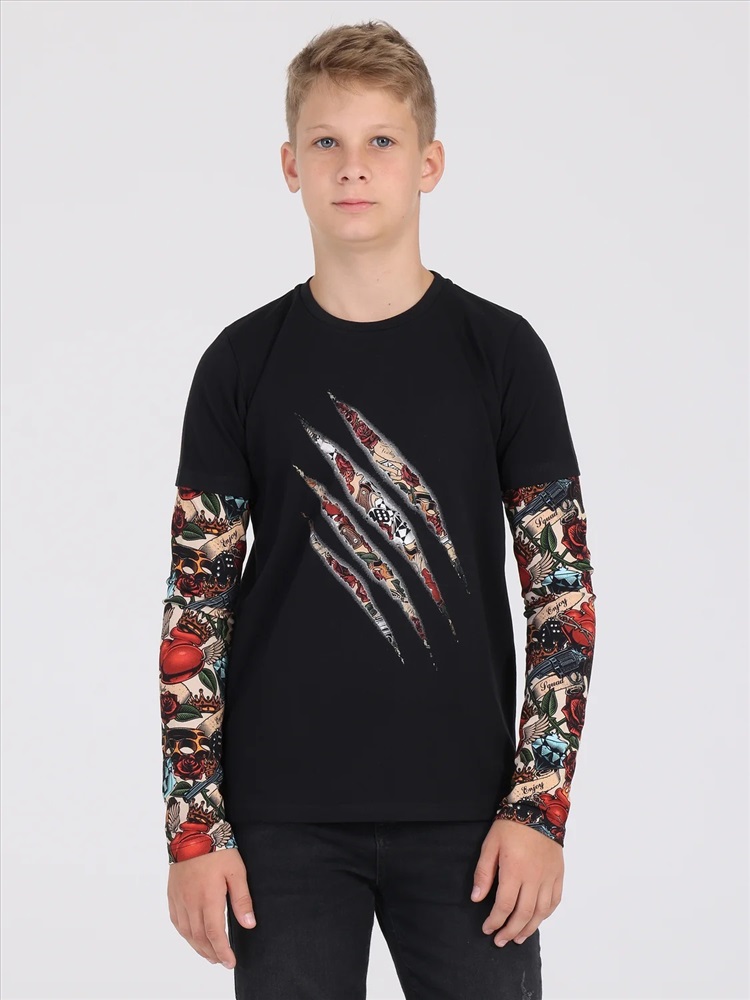 Стильный лонгслив для мальчика выполнен из кулира - тонкого хлопкового полотна с лайкрой. Изделие прямого покроя с округлым вырезом горловины и ярким принтом. Длинные рукава с эффектом 2в1 украшенные набивкой в виде татуировок не оставят равнодушными ни одного мальчишку! Уход: только машинная стирка (руками не стирать!) при температуре 40 градусов, без предварительного замачивания. Изделия с печатью и декором перед стиркой необходимо вывернуть на изнаночную сторону.