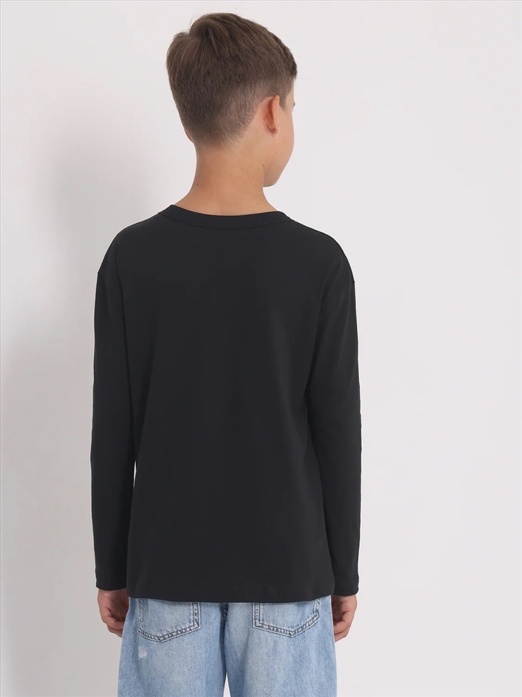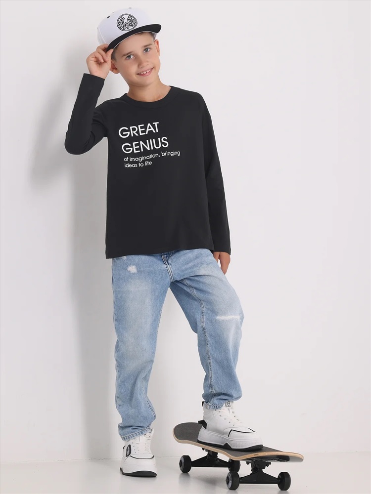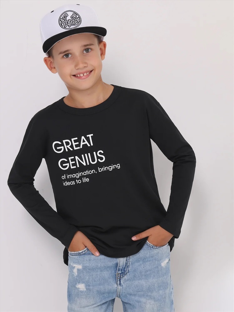 Лонгслив для мальчика выполнен из кулира – легкого хлопкового плотна. Изделие прямого силуэта и свободного кроя, с длинными рукавами со спущенной линией плеча, вырез горловины обработан эластичной бейкой из полотна компаньона. Украшен стильным принтом. Уход: только машинная стирка (руками не стирать!) при температуре 40 градусов, без предварительного замачивания. Изделия с печатью перед стиркой необходимо вывернуть на изнаночную сторону.